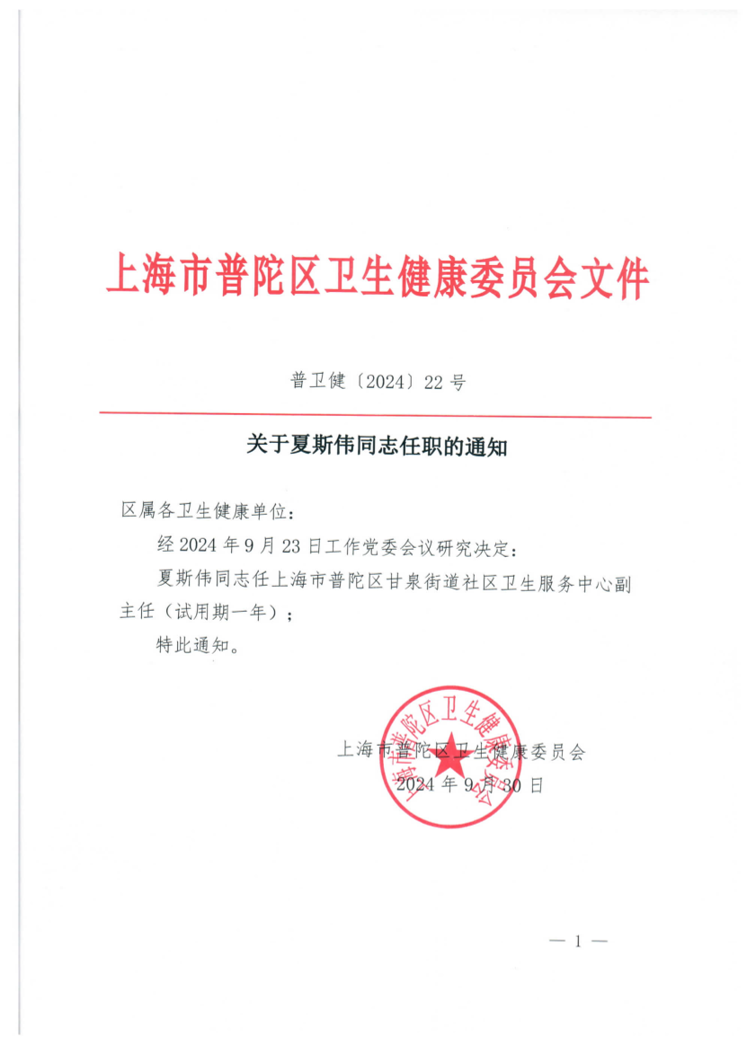 夏斯伟同志任上海市普陀区甘泉街道社区卫生服务中心副主任(试用期一年);