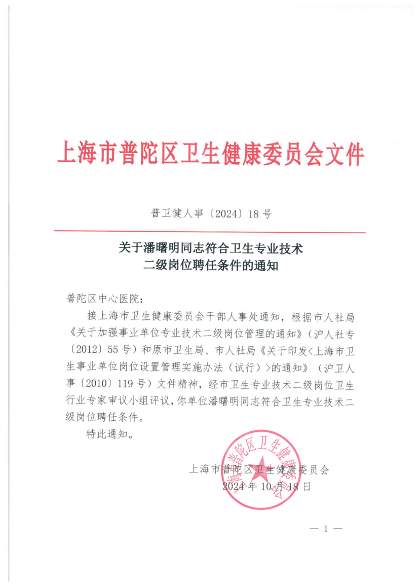 接上海市卫生健康委员会干部人事处通知,根据市人社局《关于加强事业单位专业技术二级岗位管理的通知》(沪人社专〔2012〕55号)和原市卫生局、市人社局《关于印发<上海市卫生事业单位岗位设置管理实施办法(试行)>的通知》(沪卫人事〔2010〕119号)文件精神,经市卫生专业技术二级岗位卫生行业专家审议小组评议,你单位潘曙明同志符合卫生专业技术二级岗位聘任条件。
