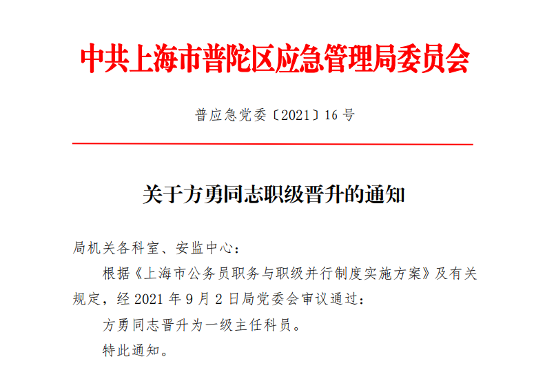 根据《上海市公务员职务与职级并行制度实施方案》及有关规定,经2021年9月2日局党委会审议通过: