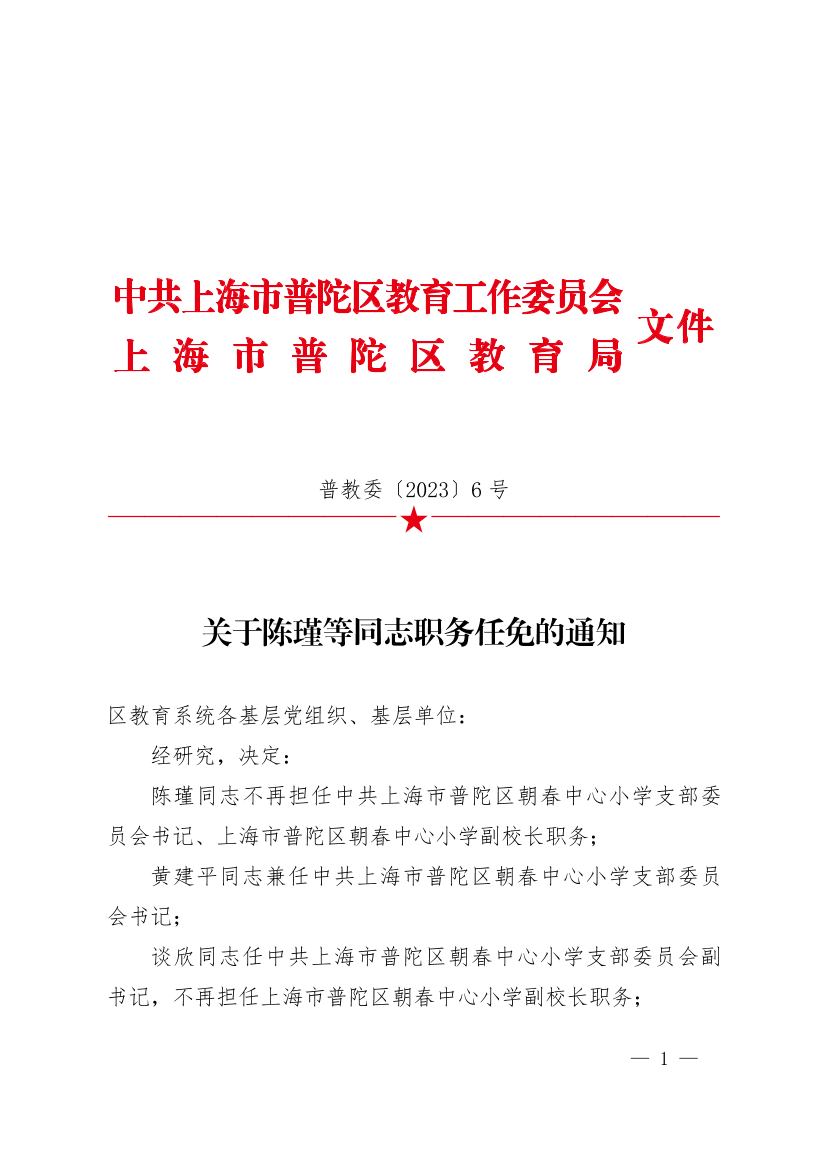 陈瑾同志不再担任中共上海市普陀区朝春中心小学支部委员会书记、上海市普陀区朝春中心小学副校长职务;