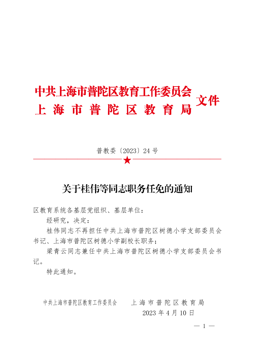 桂伟同志不再担任中共上海市普陀区树德小学支部委员会书记、上海市普陀区树德小学副校长职务;