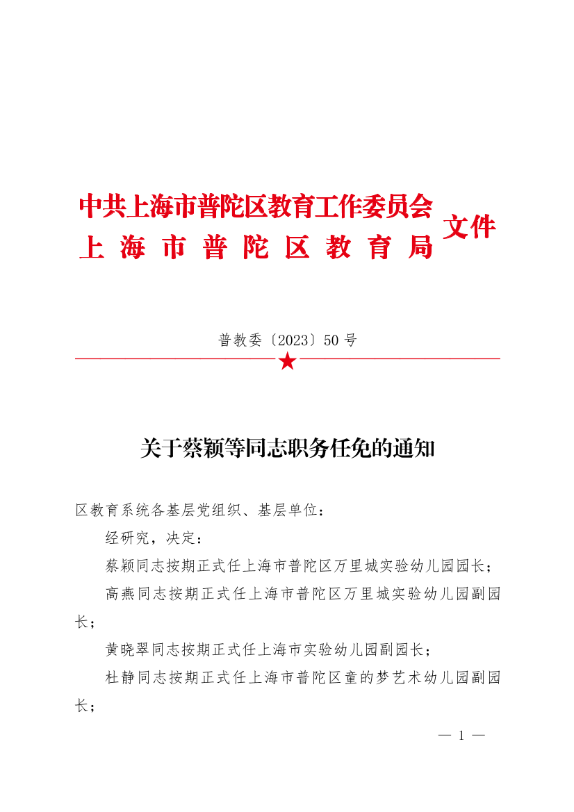 蔡颖同志按期正式任上海市普陀区万里城实验幼儿园园长;