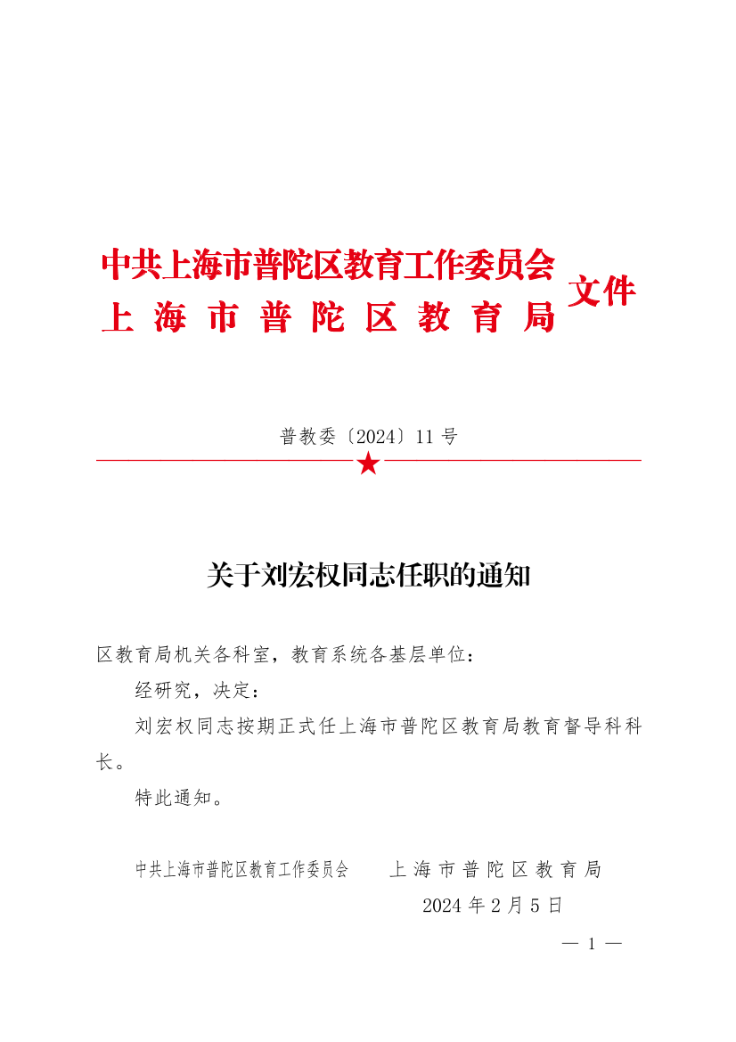 刘宏权同志按期正式任上海市普陀区教育局教育督导科科长。