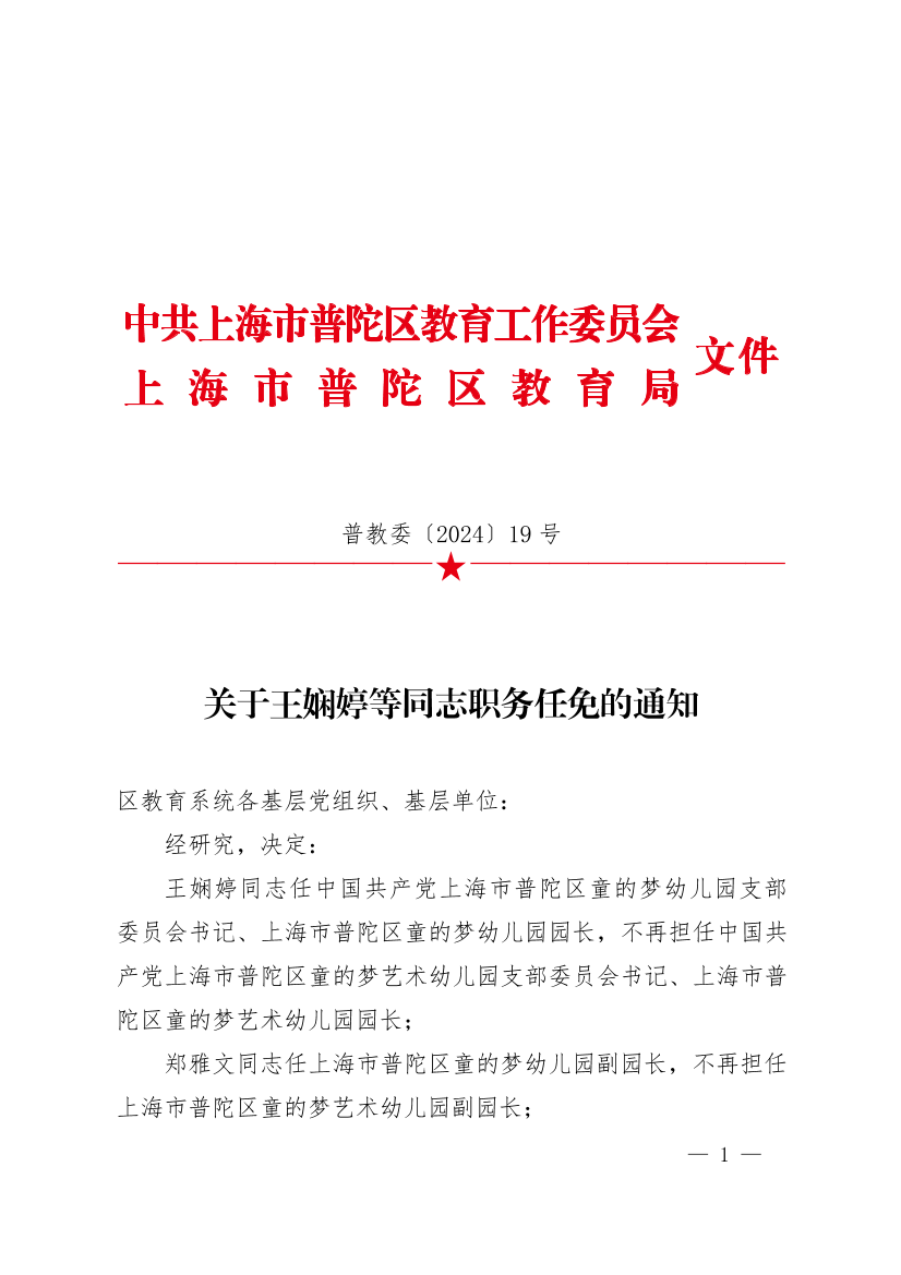 王娴婷同志任中国共产党上海市普陀区童的梦幼儿园支部委员会书记、上海市普陀区童的梦幼儿园园长,不再担任中国共产党上海市普陀区童的梦艺术幼儿园支部委员会书记、上海市普陀区童的梦艺术幼儿园园长;