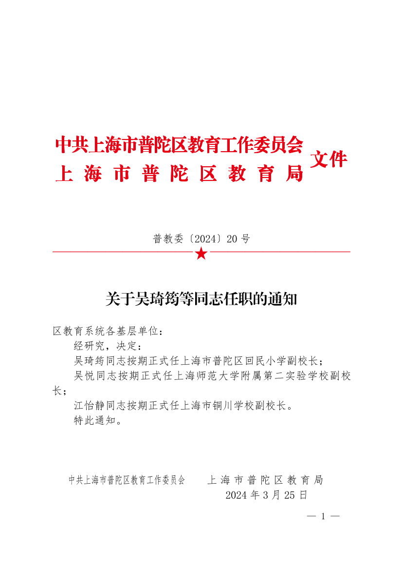 吴琦筠同志按期正式任上海市普陀区回民小学副校长;
