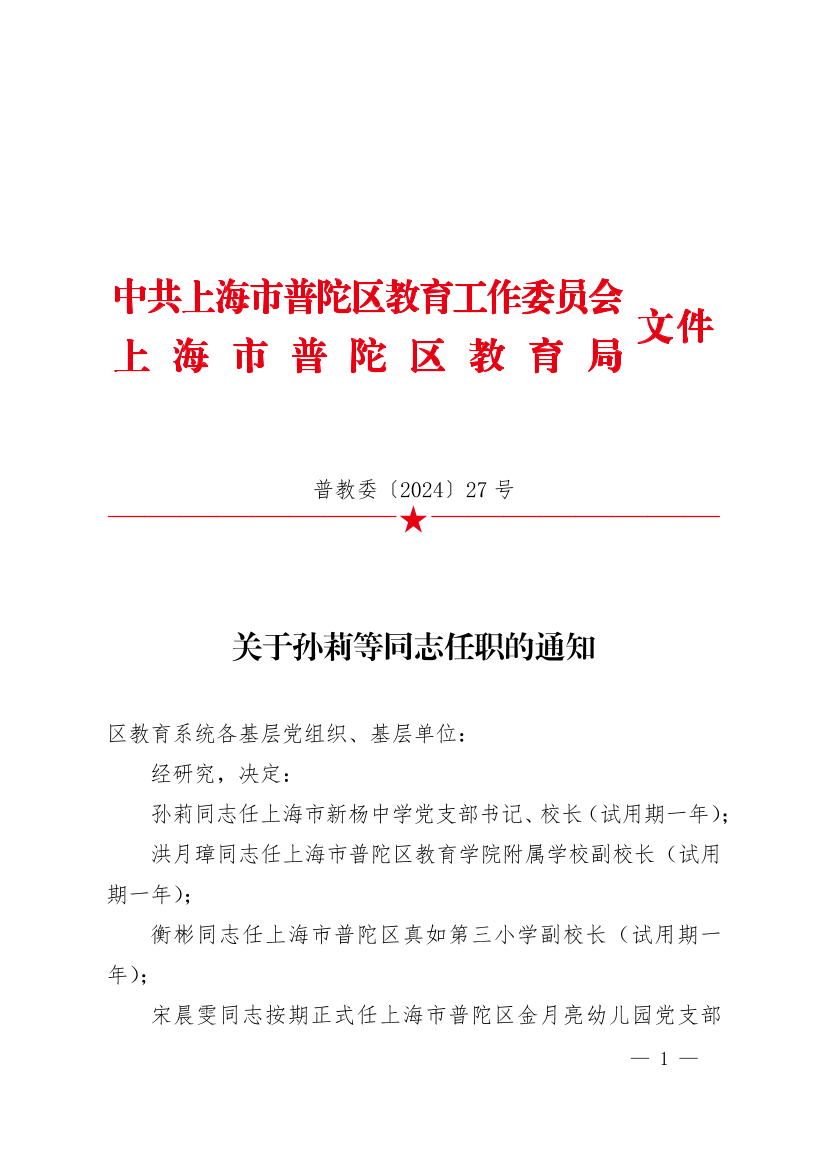 孙莉同志任上海市新杨中学党支部书记、校长(试用期一年);