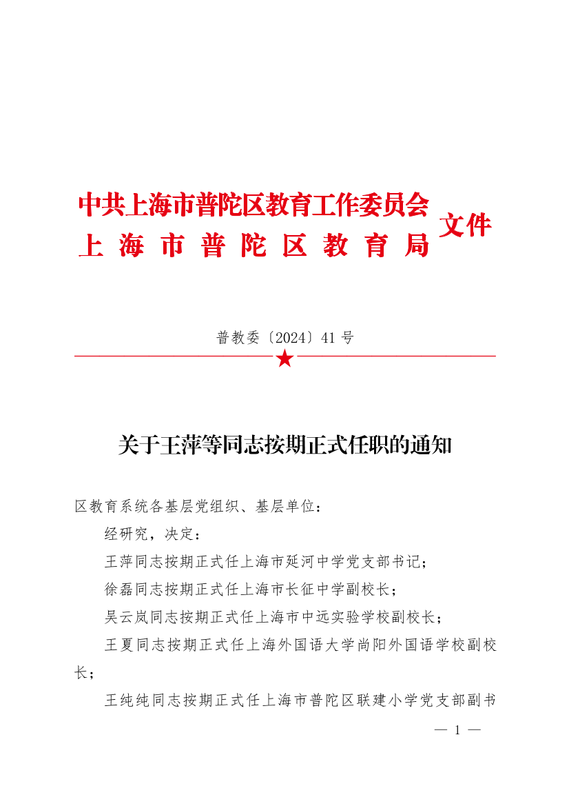 王纯纯同志按期正式任上海市普陀区联建小学党支部副书记;