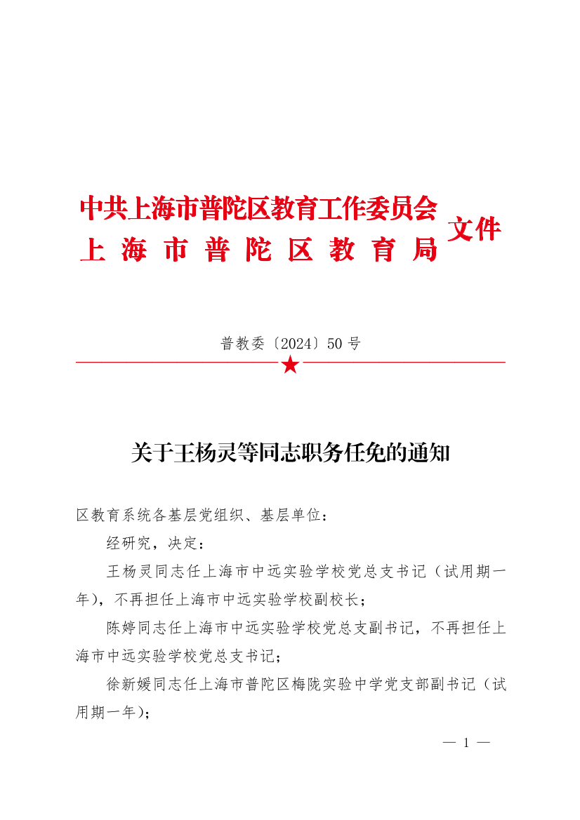 王杨灵同志任上海市中远实验学校党总支书记(试用期一年),不再担任上海市中远实验学校副校长;