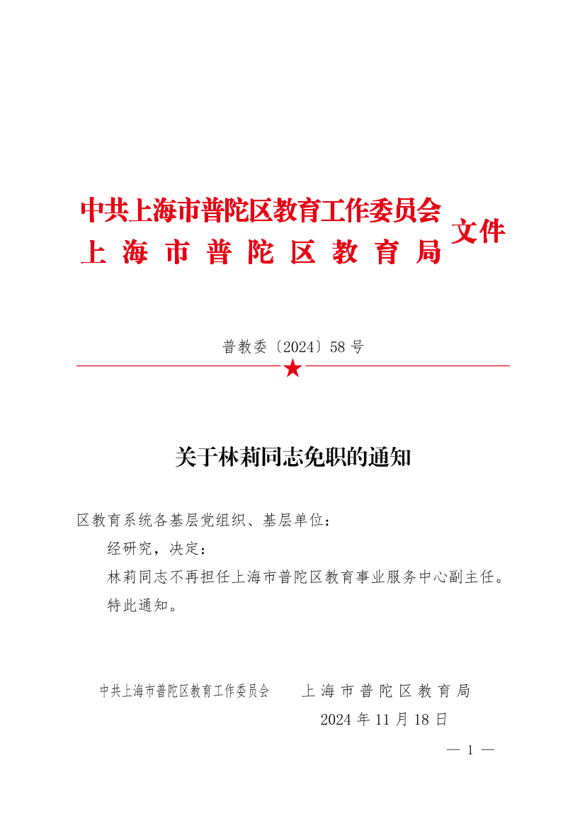 林莉同志不再担任上海市普陀区教育事业服务中心副主任。