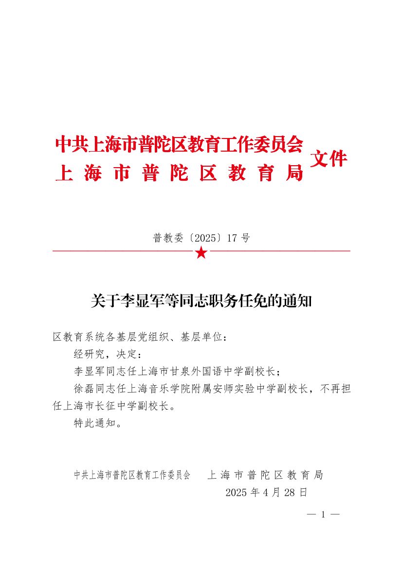 徐磊同志任上海音乐学院附属安师实验中学副校长,不再担任上海市长征中学副校长。