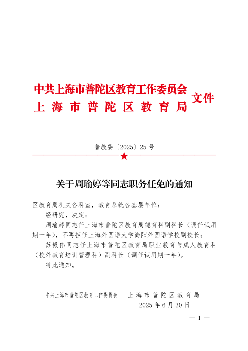 周瑜婷同志任上海市普陀区教育局德育科副科长(调任试用期一年),不再担任上海外国语大学尚阳外国语学校副校长;