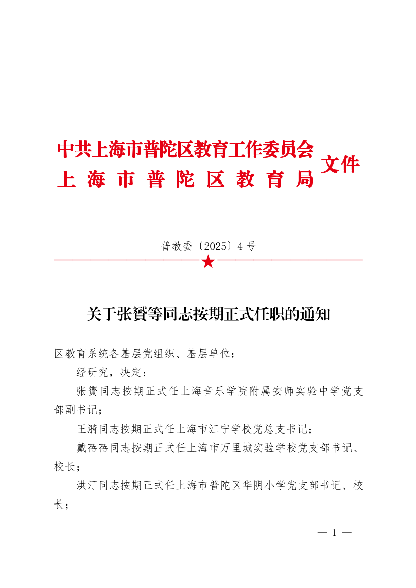 戴蓓蓓同志按期正式任上海市万里城实验学校党支部书记、校长;