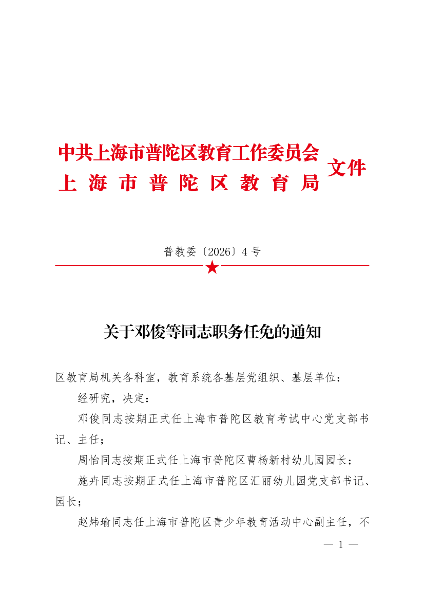 邓俊同志按期正式任上海市普陀区教育考试中心党支部书记、主任;
