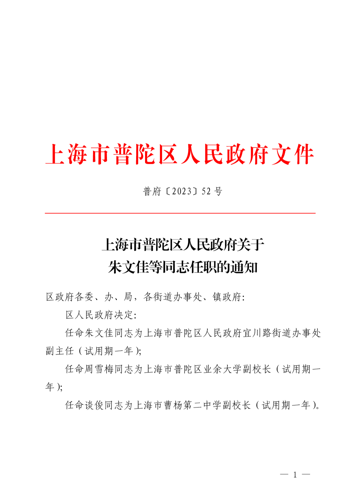 上海市普陀区人民政府关于朱文佳等同志任职的通知