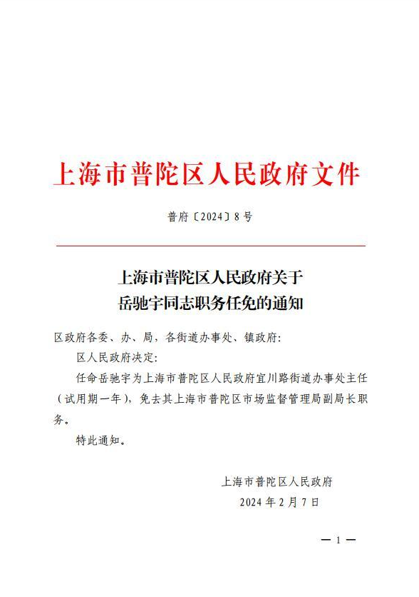 上海市普陀区人民政府关于岳驰宇同志职务任免的通知