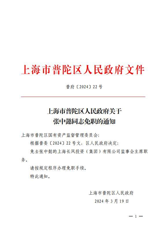 免去张中懿的上海长风投资(集团)有限公司监事会主席职务。