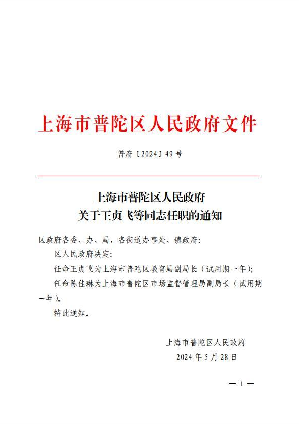 上海市普陀区人民政府关于王贞飞等同志任职的通知