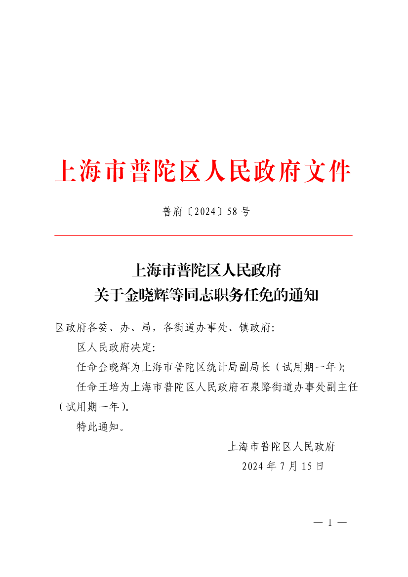 上海市普陀区人民政府关于金晓辉等同志职务任免的通知