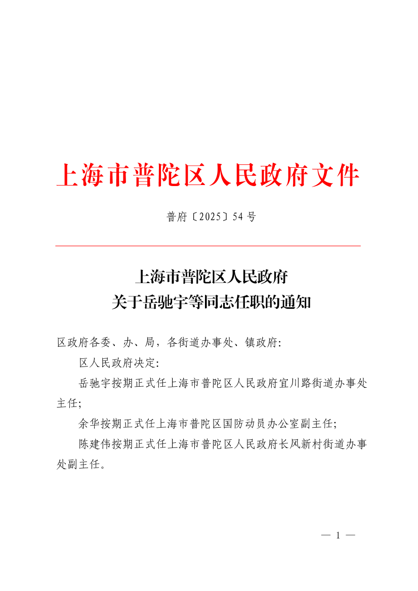 岳驰宇按期正式任上海市普陀区人民政府宜川路街道办事处主任;