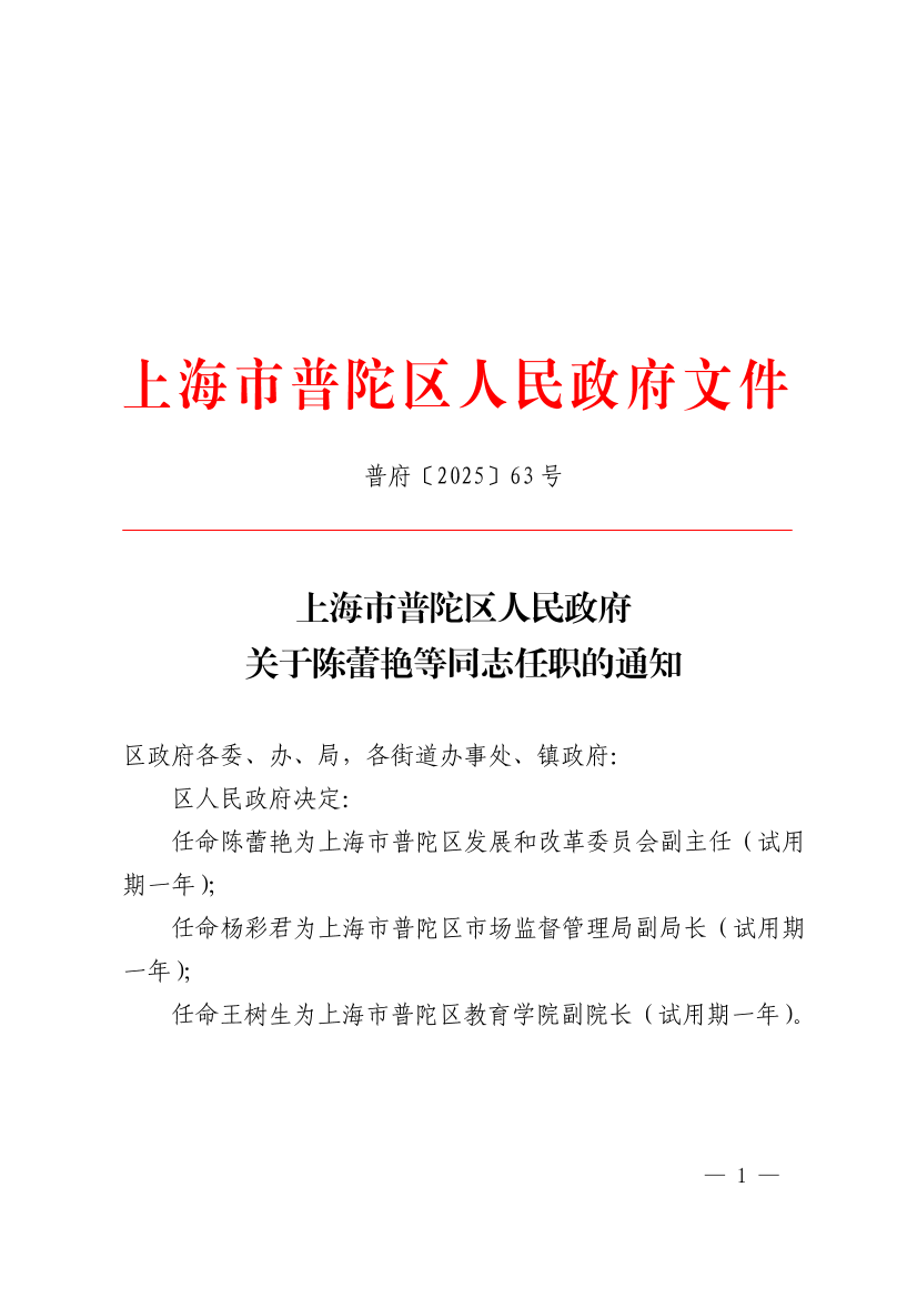 上海市普陀区人民政府关于陈蕾艳等同志任职的通知