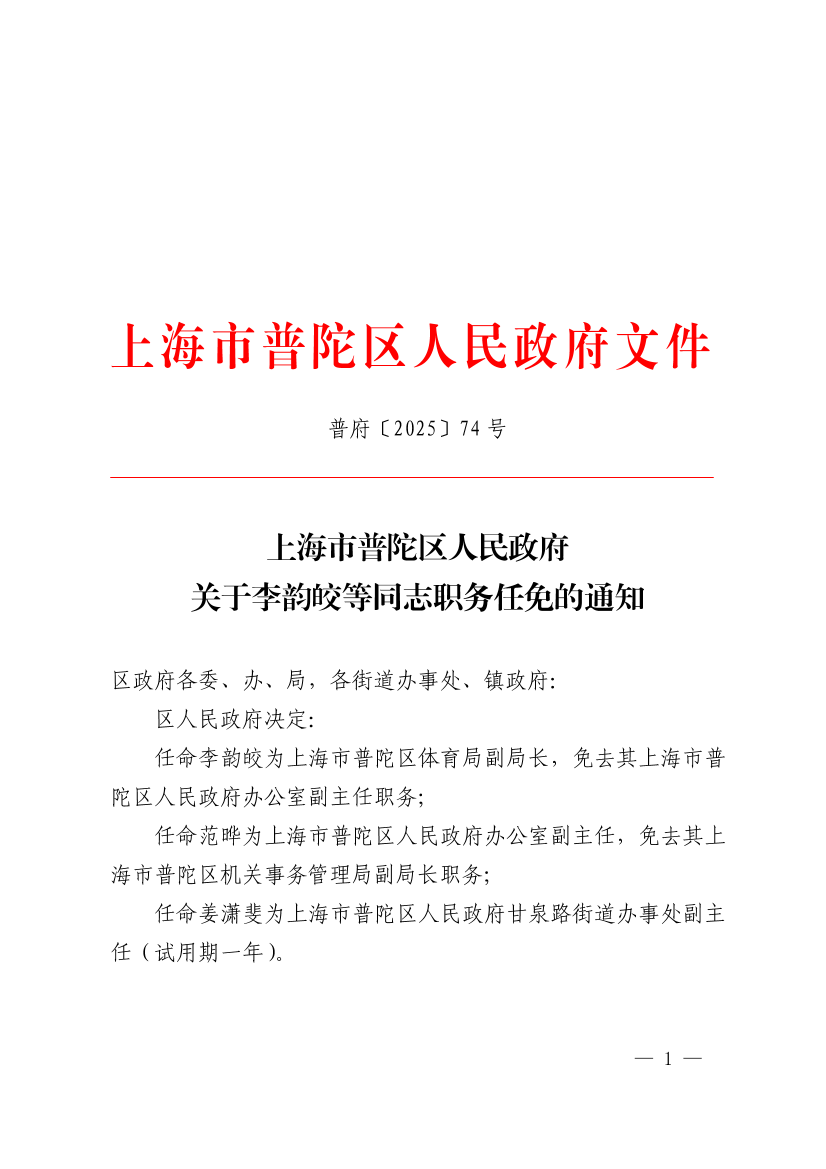 上海市普陀区人民政府关于李韵皎等同志职务任免的通知