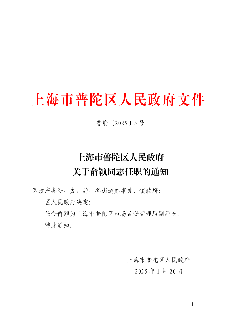 上海市普陀区人民政府关于俞颖同志任职的通知