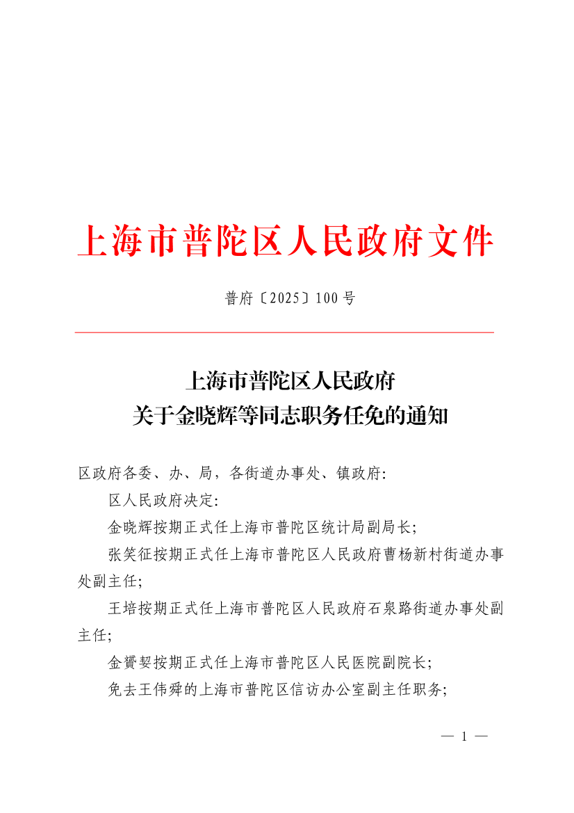 上海市普陀区人民政府关于金晓辉等同志职务任免的通知
