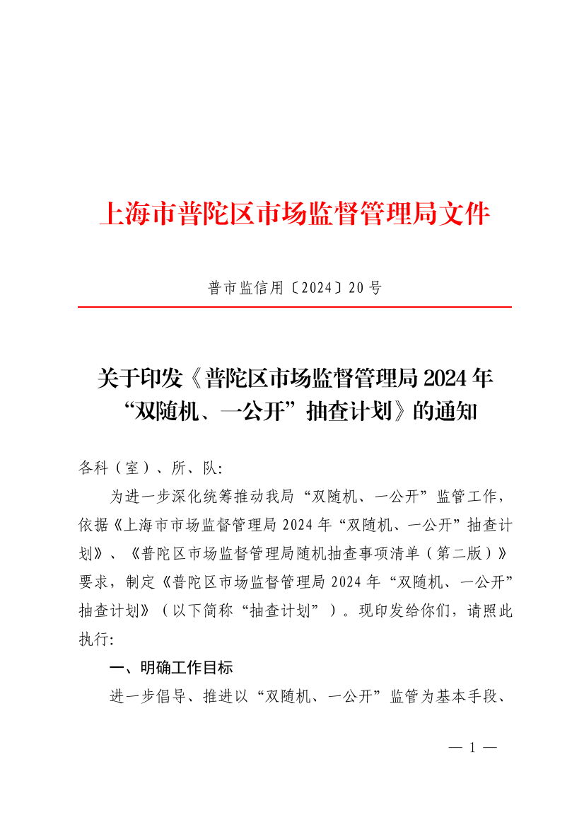 关于印发《普陀区市场监督管理局2024年“双随机、一公开”抽查计划》的通知
