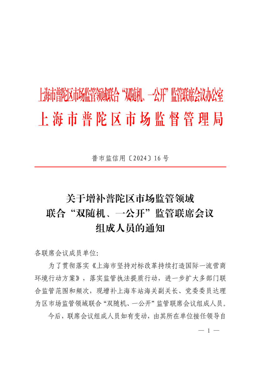 关于增补普陀区市场监管领域联合“双随机、一公开”监管联席会议组成人员的通知