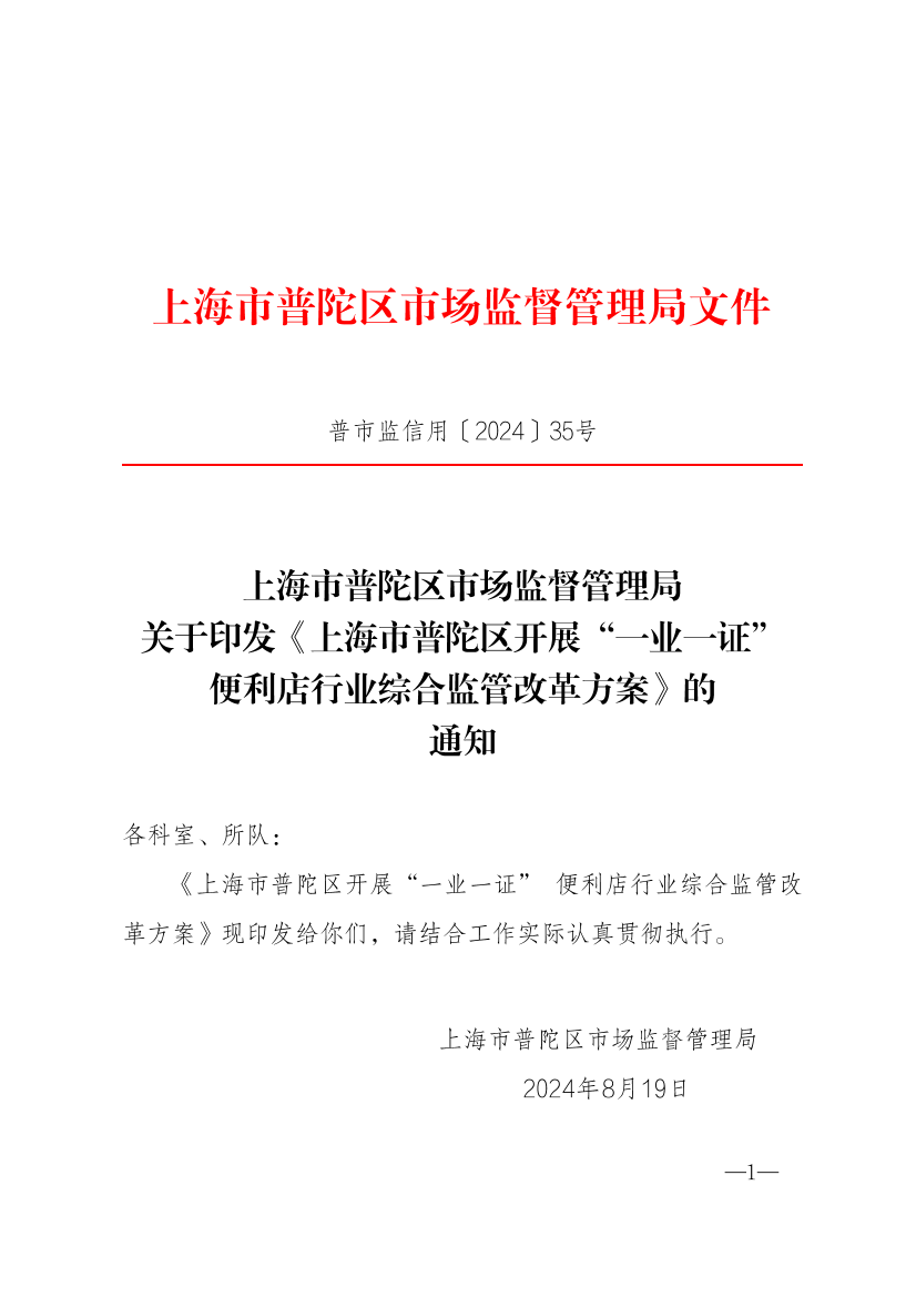 上海市普陀区市场监督管理局关于印发《上海市普陀区开展“一业一证” 便利店行业综合监管改革方案》的 通知