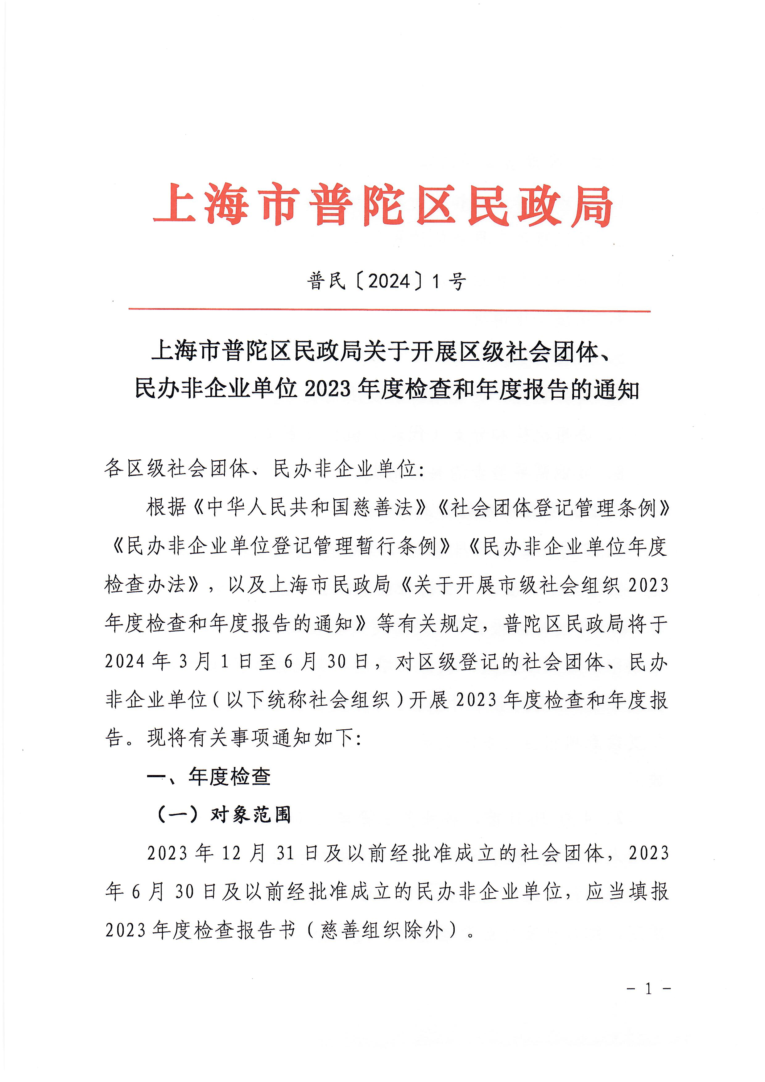 根据《中华人民共和国慈善法》《社会团体登记管理条例》《民办非企业单位登记管理暂行条例》《民办非企业单位年度检查办法》,以及上海市民政局《关于开展市级社会组织2023年度检查和年度报告的通知》等有关规定,普陀区民政局将于2024年3月1日至6月30日,对区级登记的社会团体、民办非企业单位(以下统称社会组织)开展2023年度检查和年度报告。现将有关事项通知如下: