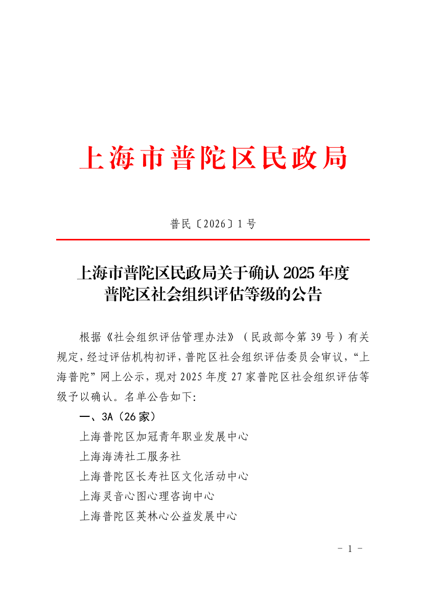 上海市普陀区民政局关于确认2025年度普陀区社会组织评估等级的公告