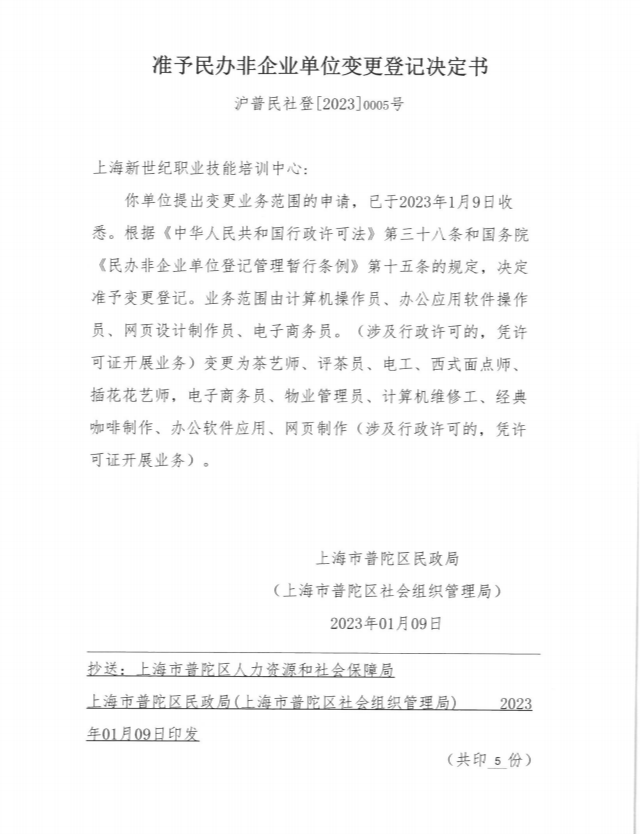 你单位提出变更业务范围的申请,已于2023年1月9日收悉。根据《中华人民共和国行政许可法》第三十八条和国务院《民办非企业单位登记管理暂行条例》第十五条的规定,决定准予变更登记。业务范围由计算机操作员、办公应用软件操作员、网页设计制作员、电子商务员。(涉及行政许可的,凭许可证开展业务)变更为茶艺师、评茶员、电工、西式面点师、插花花艺师,电子商务员、物业管理员、计算机维修工、经典咖啡制作、办公软件应用、网页制作(涉及行政许可的,凭许可证开展业务)。