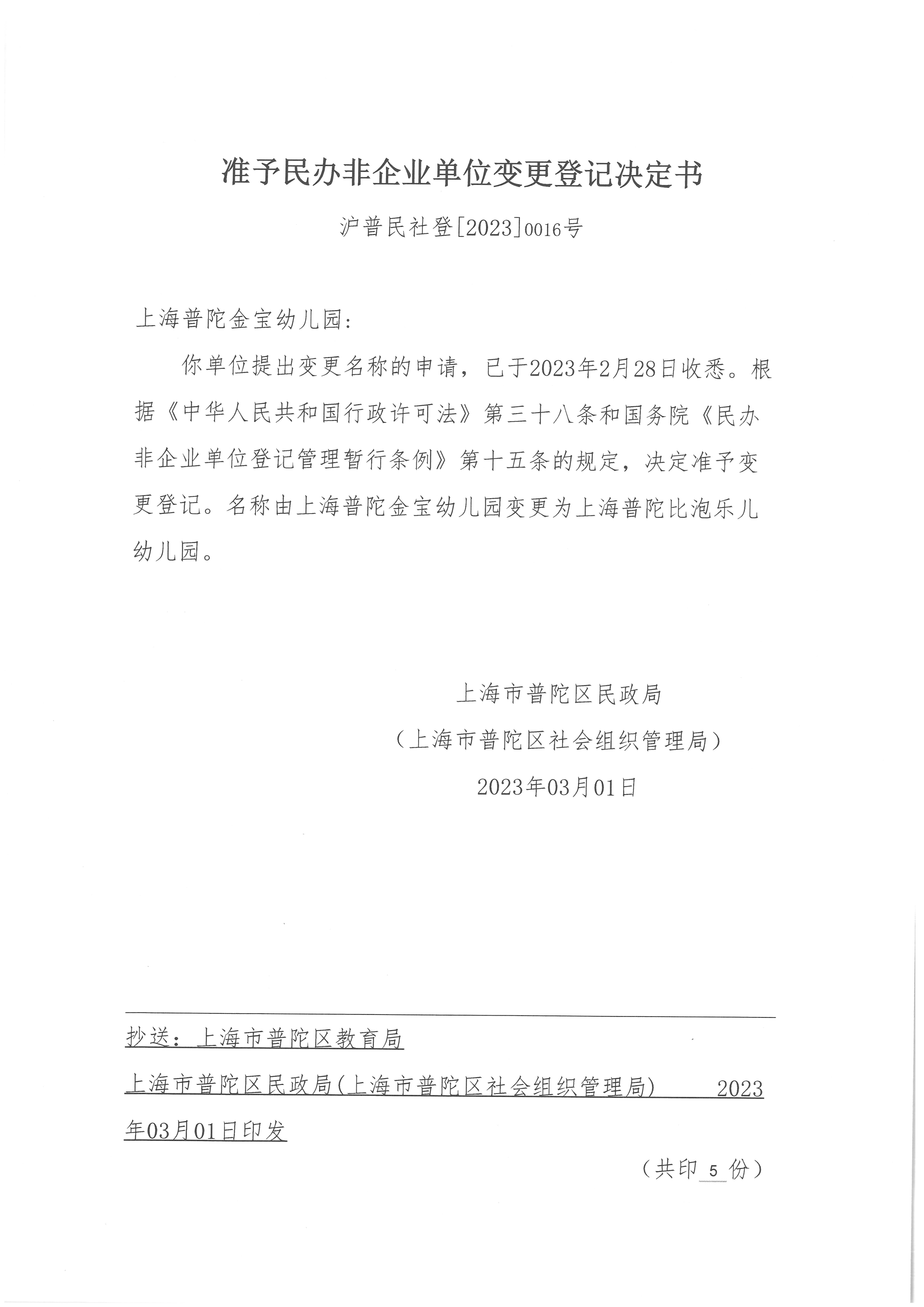 你单位提出变更名称的申请,已于2023年2月28日收悉。根据《中华人民共和国行政许可法》第三十八条和国务院《民办非企业单位登记管理暂行条例》第十五条的规定,决定准予变更登记。名称由上海普陀金宝幼儿园变更为上海普陀比泡乐儿幼儿园。