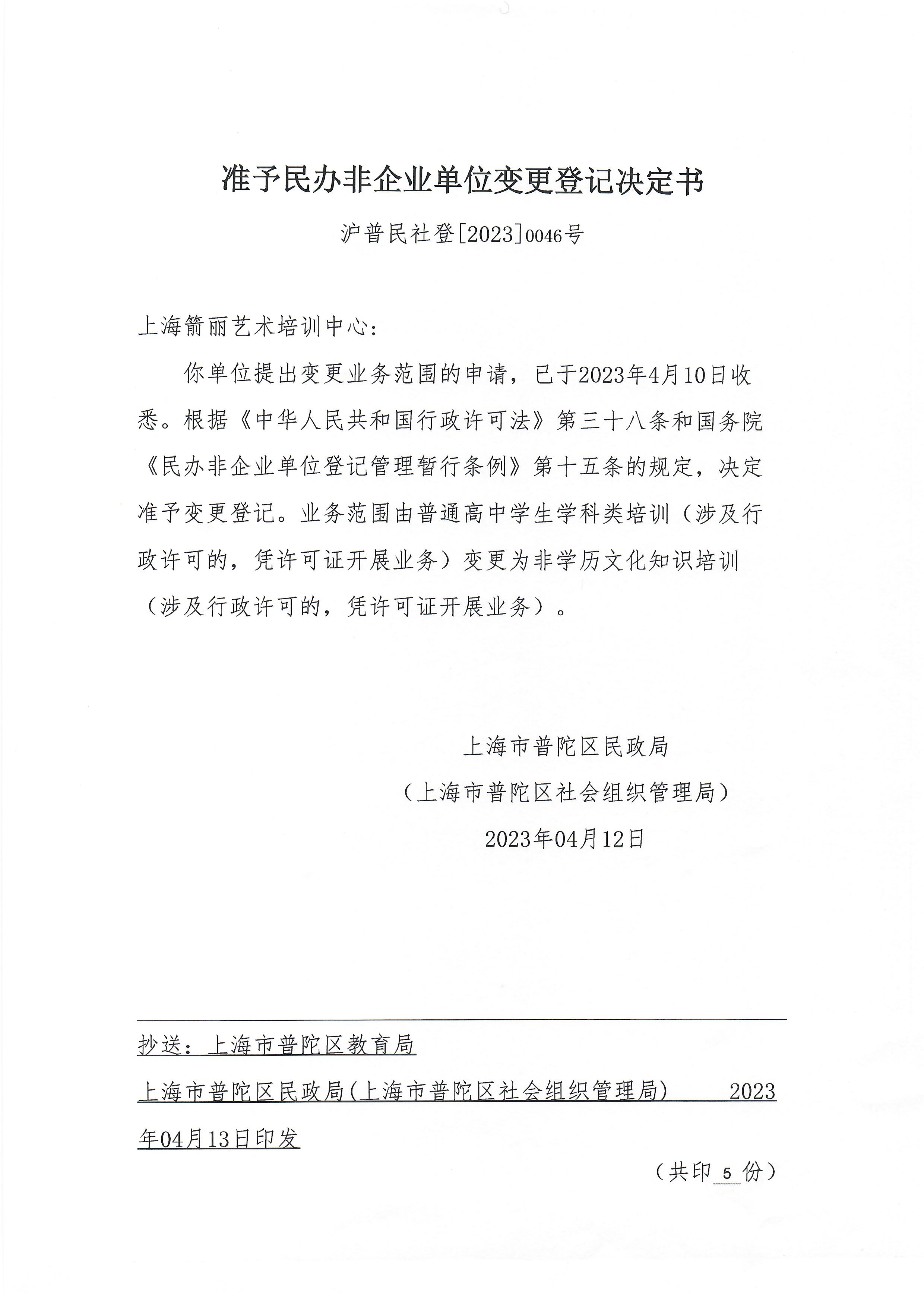 你单位提出变更业务范围的申请,已于2023年4月10日收悉。根据《中华人民共和国行政许可法》第三十八条和国务院《民办非企业单位登记管理暂行条例》第十五条的规定,决定准予变更登记。业务范围由普通高中学生学科类培训(涉及行政许可的,凭许可证开展业务)变更为非学历文化知识培训(涉及行政许可的,凭许可证开展业务)。