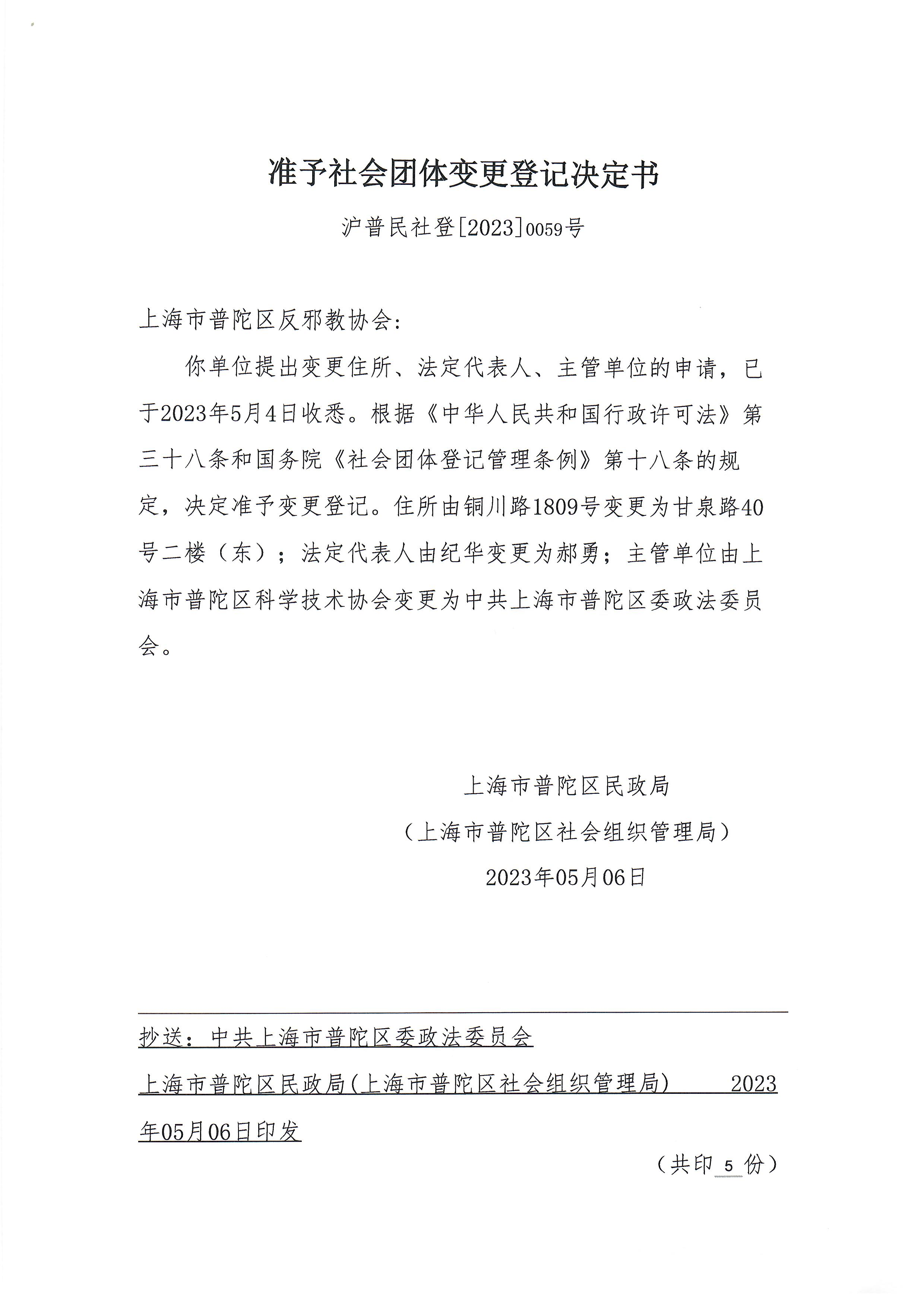 你单位提出变更住所、法定代表人、主管单位的申请,已于2023年5月4日收悉。根据《中华人民共和国行政许可法》第三十八条和国务院《社会团体登记管理条例》第十八条的规定,决定准予变更登记。住所由铜川路1809号变更为甘泉路40号二楼(东);法定代表人由纪华变更为郝勇;主管单位由上海市普陀区科学技术协会变更为中共上海市普陀区委政法委员会。