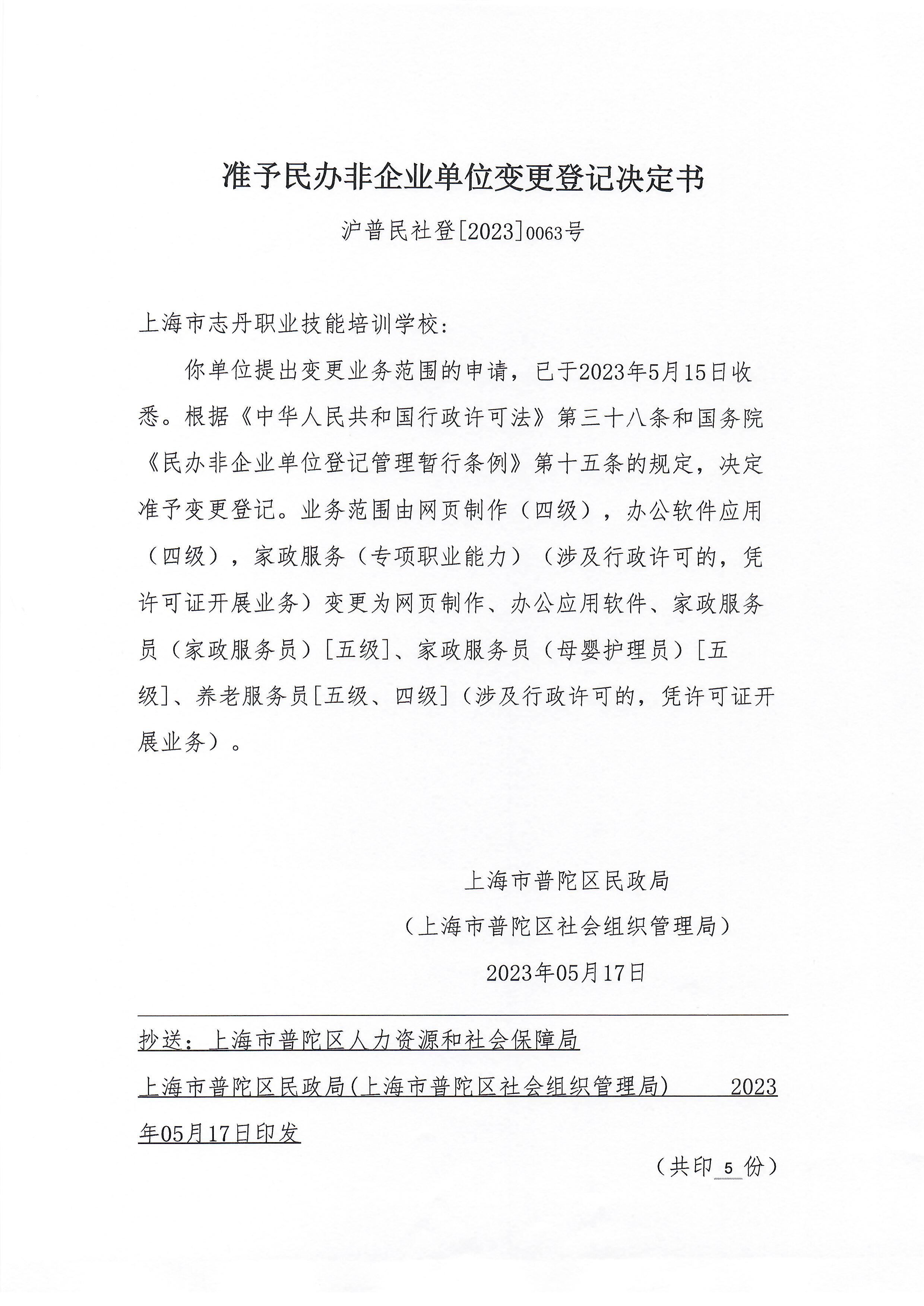 你单位提出变更业务范围的申请,已于2023年5月15日收悉。根据《中华人民共和国行政许可法》第三十八条和国务院《民办非企业单位登记管理暂行条例》第十五条的规定,决定准予变更登记。业务范围由网页制作(四级),办公软件应用(四级),家政服务(专项职业能力)(涉及行政许可的,凭许可证开展业务)变更为网页制作、办公应用软件、家政服务员(家政服务员)[五级]、家政服务员(母婴护理员)[五级]、养老服务员[五级、四级](涉及行政许可的,凭许可证开展业务)。