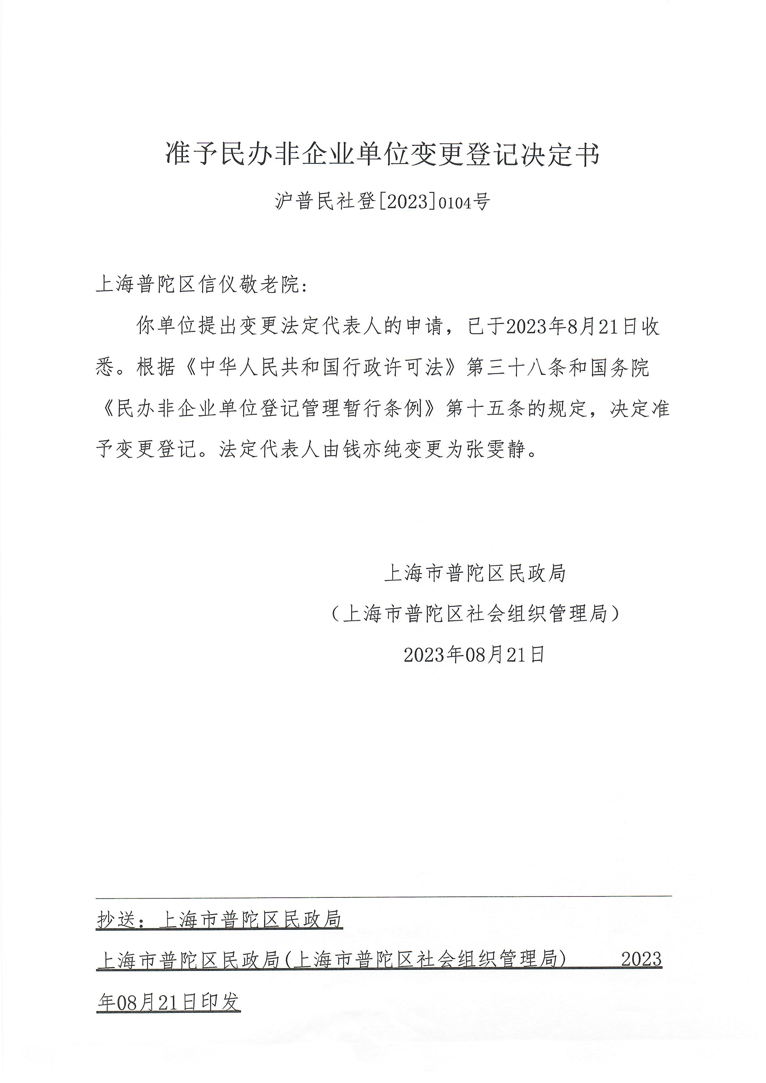 你单位提出变更法定代表人的申请,已于2023年8月21日收悉。根据《中华人民共和国行政许可法》第三十八条和国务院《民办非企业单位登记管理暂行条例》第十五条的规定,决定准予变更登记。法定代表人由钱亦纯变更为张雯静。