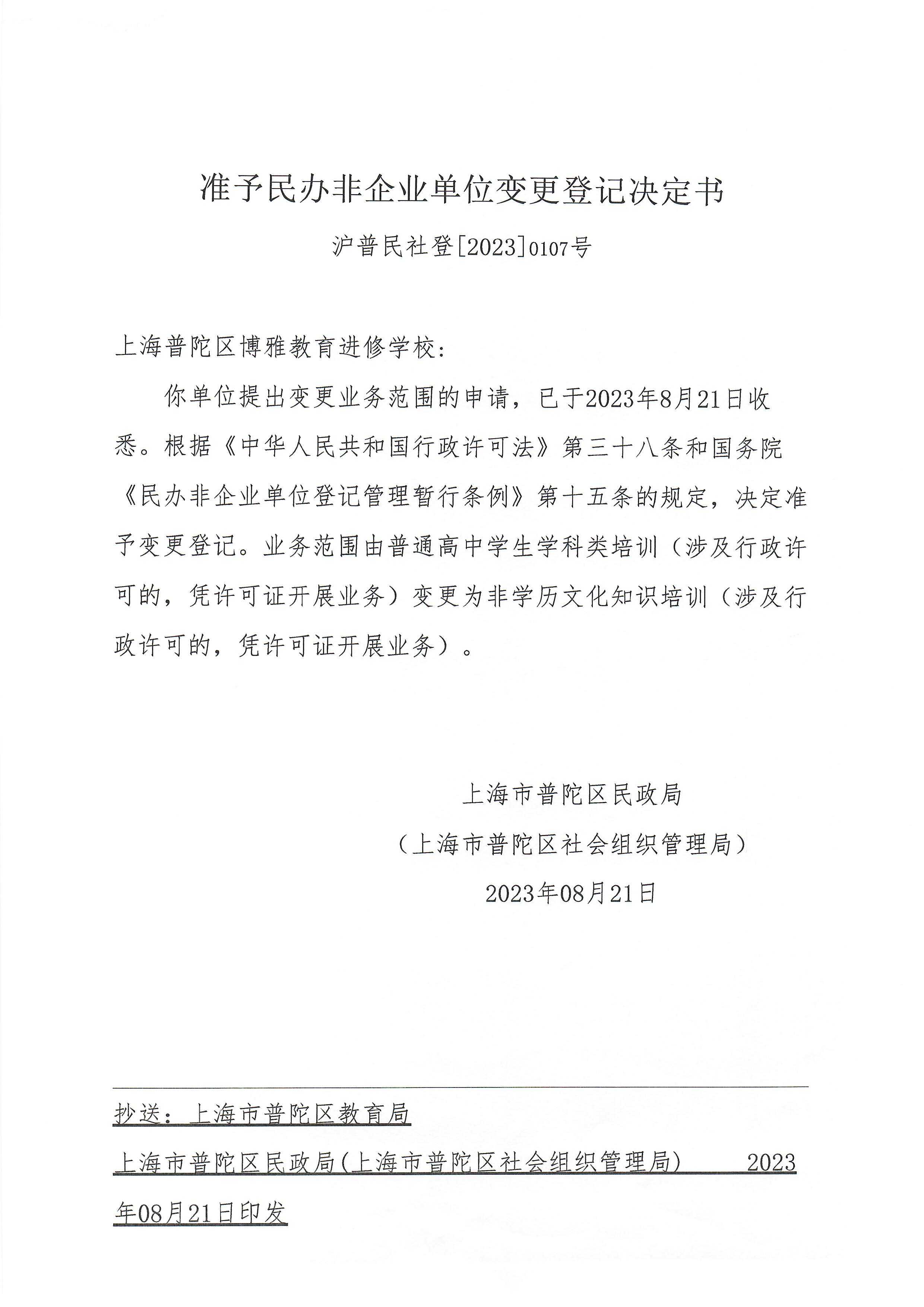 你单位提出变更业务范围的申请,已于2023年8月21日收悉。根据《中华人民共和国行政许可法》第三十八条和国务院《民办非企业单位登记管理暂行条例》第十五条的规定,决定准予变更登记。业务范围由普通高中学生学科类培训(涉及行政许可的,凭许可证开展业务)变更为非学历文化知识培训(涉及行政许可的,凭许可证开展业务)。