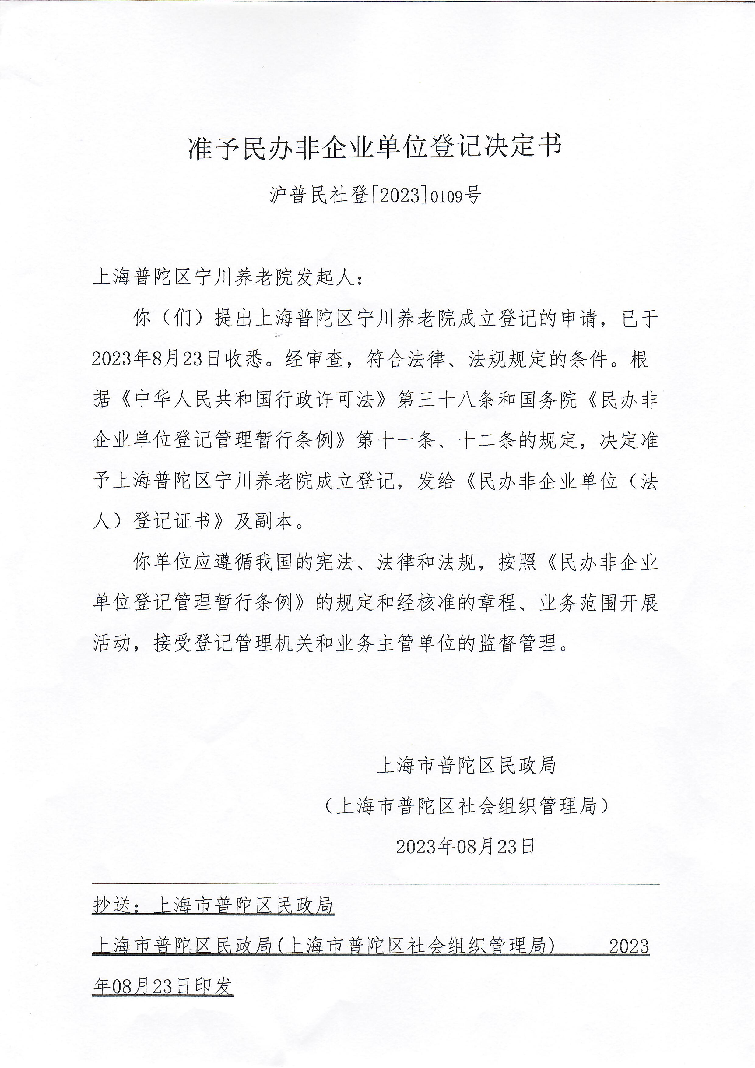 你(们)提出上海普陀区宁川养老院成立登记的申请,已于2023年8月23日收悉。经审查,符合法律、法规规定的条件。根据《中华人民共和国行政许可法》第三十八条和国务院《民办非企业单位登记管理暂行条例》第十一条、十二条的规定,决定准予上海普陀区宁川养老院成立登记,发给《民办非企业单位(法人)登记证书》及副本。