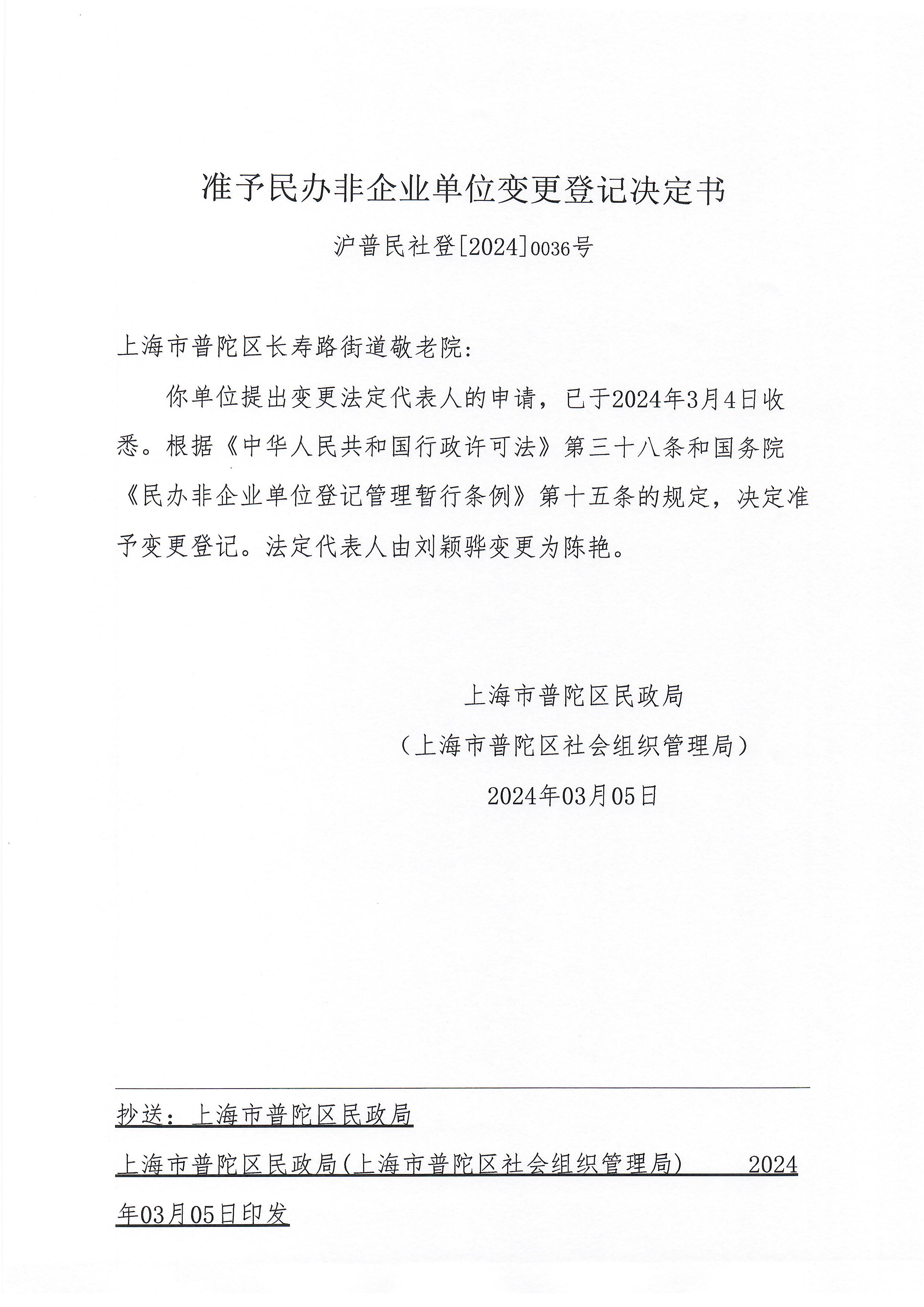 你单位提出变更法定代表人的申请,已于2024年3月4日收悉。根据《中华人民共和国行政许可法》第三十八条和国务院《民办非企业单位登记管理暂行条例》第十五条的规定,决定准予变更登记。法定代表人由刘颖骅变更为陈艳。