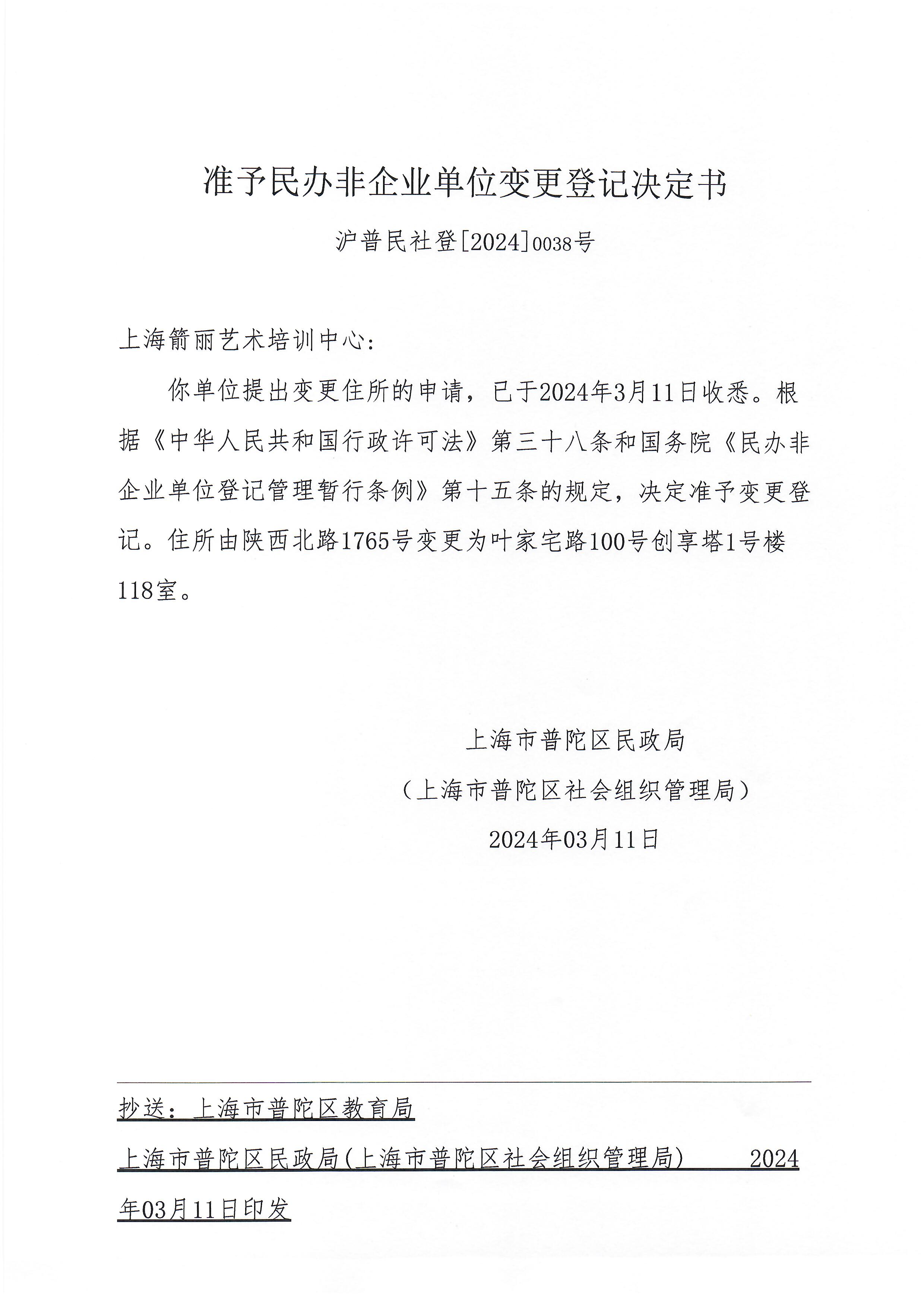 你单位提出变更住所的申请,已于2024年3月11日收悉。根据《中华人民共和国行政许可法》第三十八条和国务院《民办非企业单位登记管理暂行条例》第十五条的规定,决定准予变更登记。住所由陕西北路1765号变更为叶家宅路100号创享塔1号楼118室。