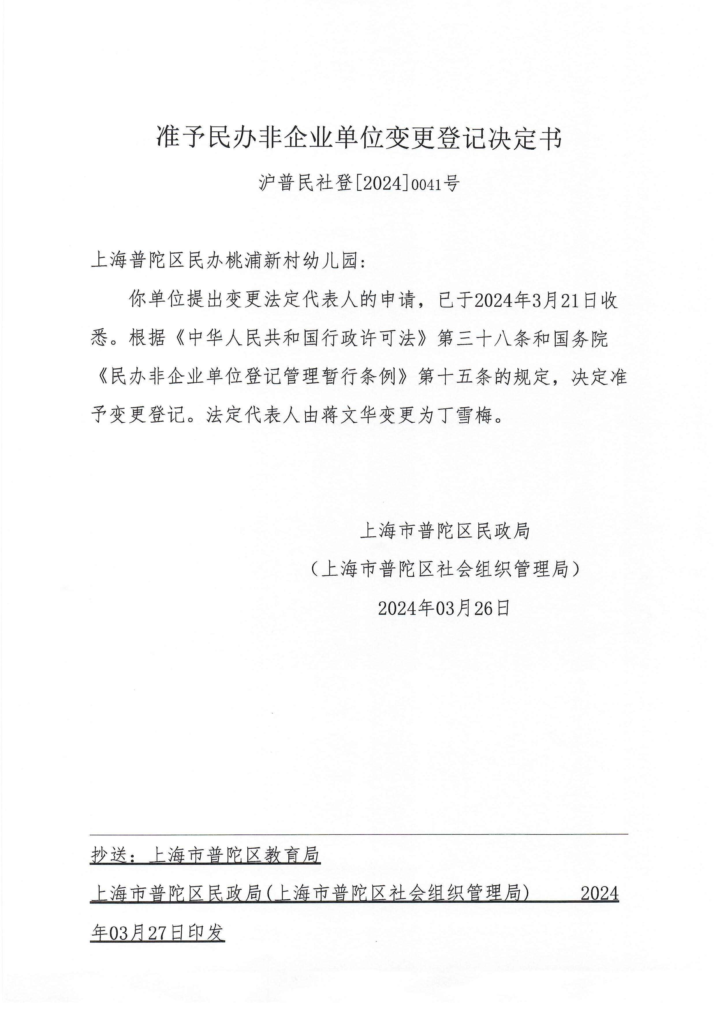 你单位提出变更法定代表人的申请,已于2024年3月21日收悉。根据《中华人民共和国行政许可法》第三十八条和国务院《民办非企业单位登记管理暂行条例》第十五条的规定,决定准予变更登记。法定代表人由蒋文华变更为丁雪梅。