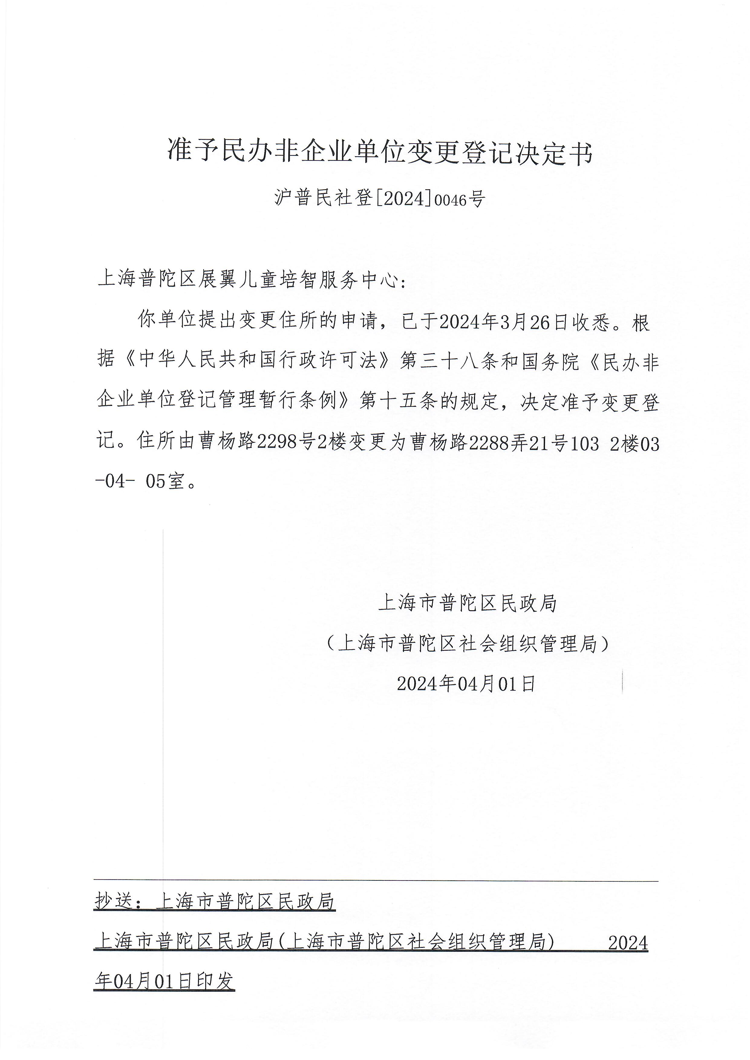 你单位提出变更住所的申请,已于2024年3月26日收悉。根据《中华人民共和国行政许可法》第三十八条和国务院《民办非企业单位登记管理暂行条例》第十五条的规定,决定准予变更登记。住所由曹杨路2298号2楼变更为曹杨路2288弄21号103 2楼03 -04- 05室。