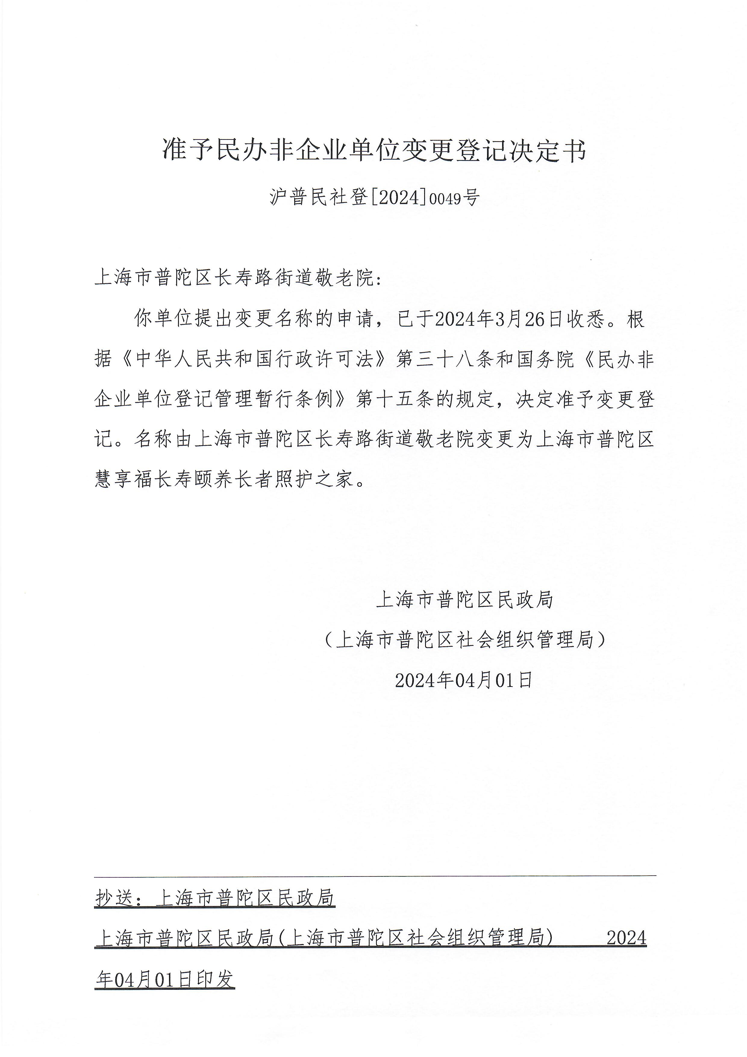 你单位提出变更名称的申请,已于2024年3月26日收悉。根据《中华人民共和国行政许可法》第三十八条和国务院《民办非企业单位登记管理暂行条例》第十五条的规定,决定准予变更登记。名称由上海市普陀区长寿路街道敬老院变更为上海市普陀区慧享福长寿颐养长者照护之家。
