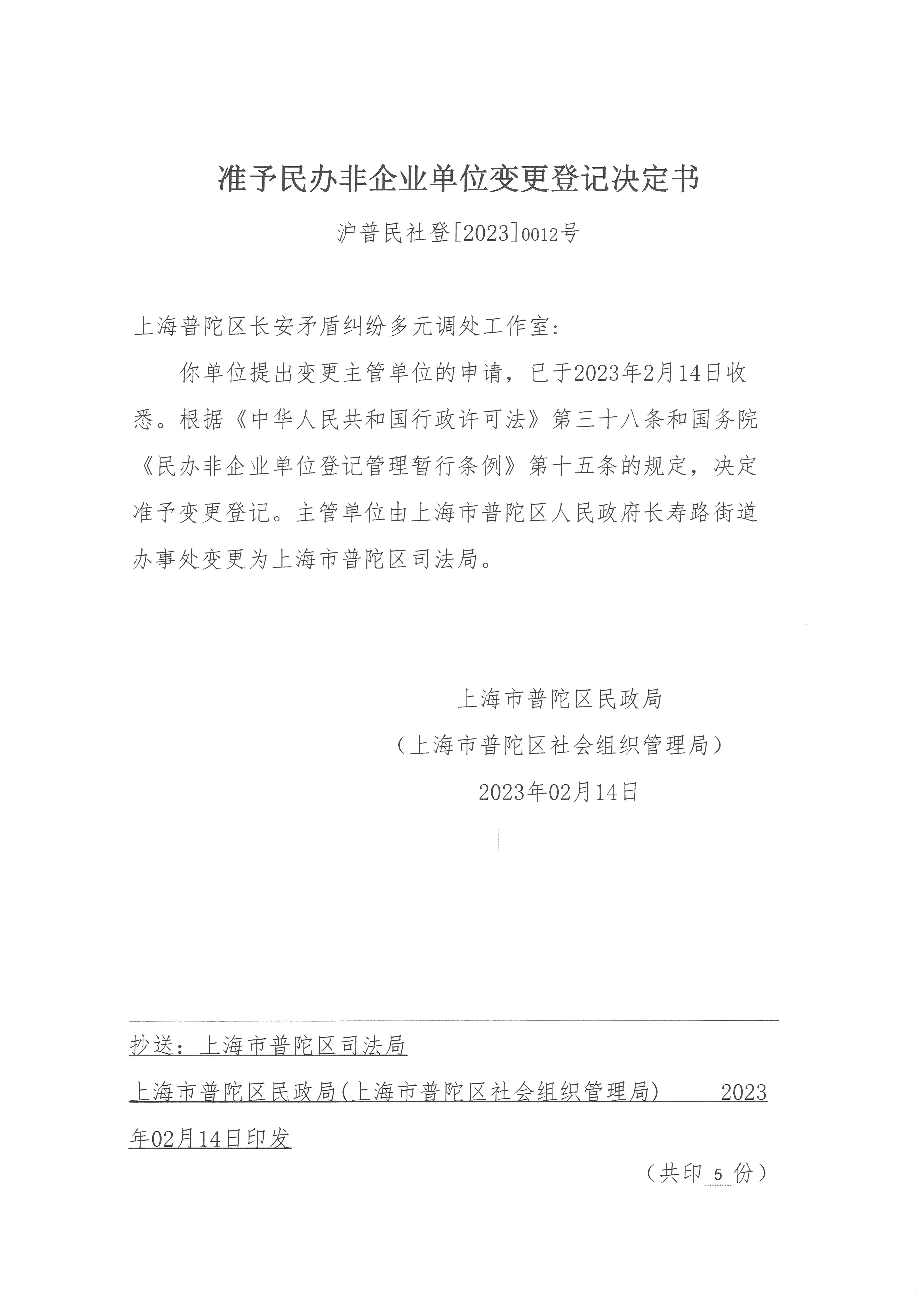 你单位提出变更主管单位的申请,已于2023年2月14日收悉。根据《中华人民共和国行政许可法》第三十八条和国务院《民办非企业单位登记管理暂行条例》第十五条的规定,决定准予变更登记。主管单位由上海市普陀区人民政府长寿路街道办事处变更为上海市普陀区司法局。