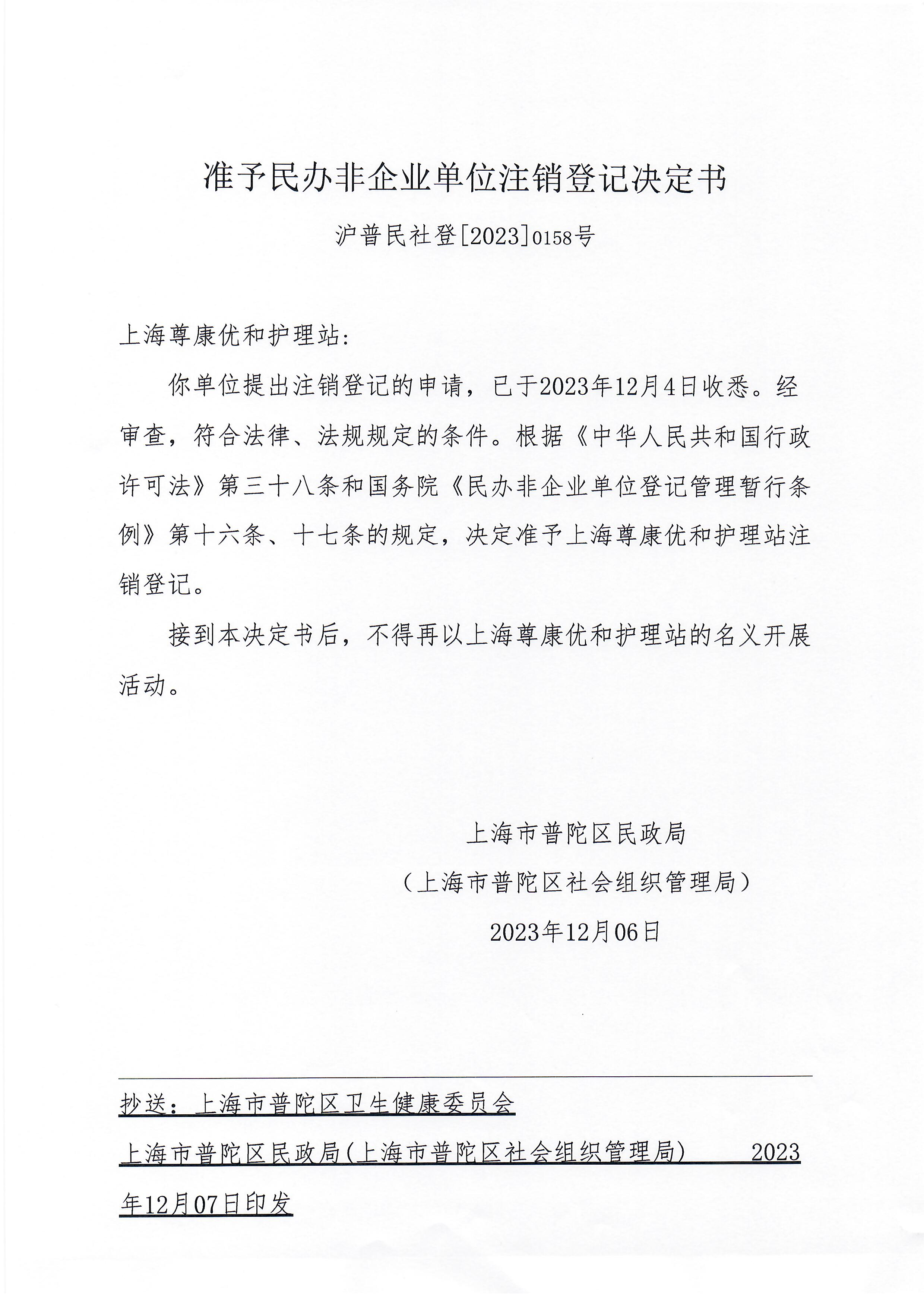你单位提出注销登记的申请,已于2023年12月4日收悉。经审查,符合法律、法规规定的条件。根据《中华人民共和国行政许可法》第三十八条和国务院《民办非企业单位登记管理暂行条例》第十六条、十七条的规定,决定准予上海尊康优和护理站注销登记。