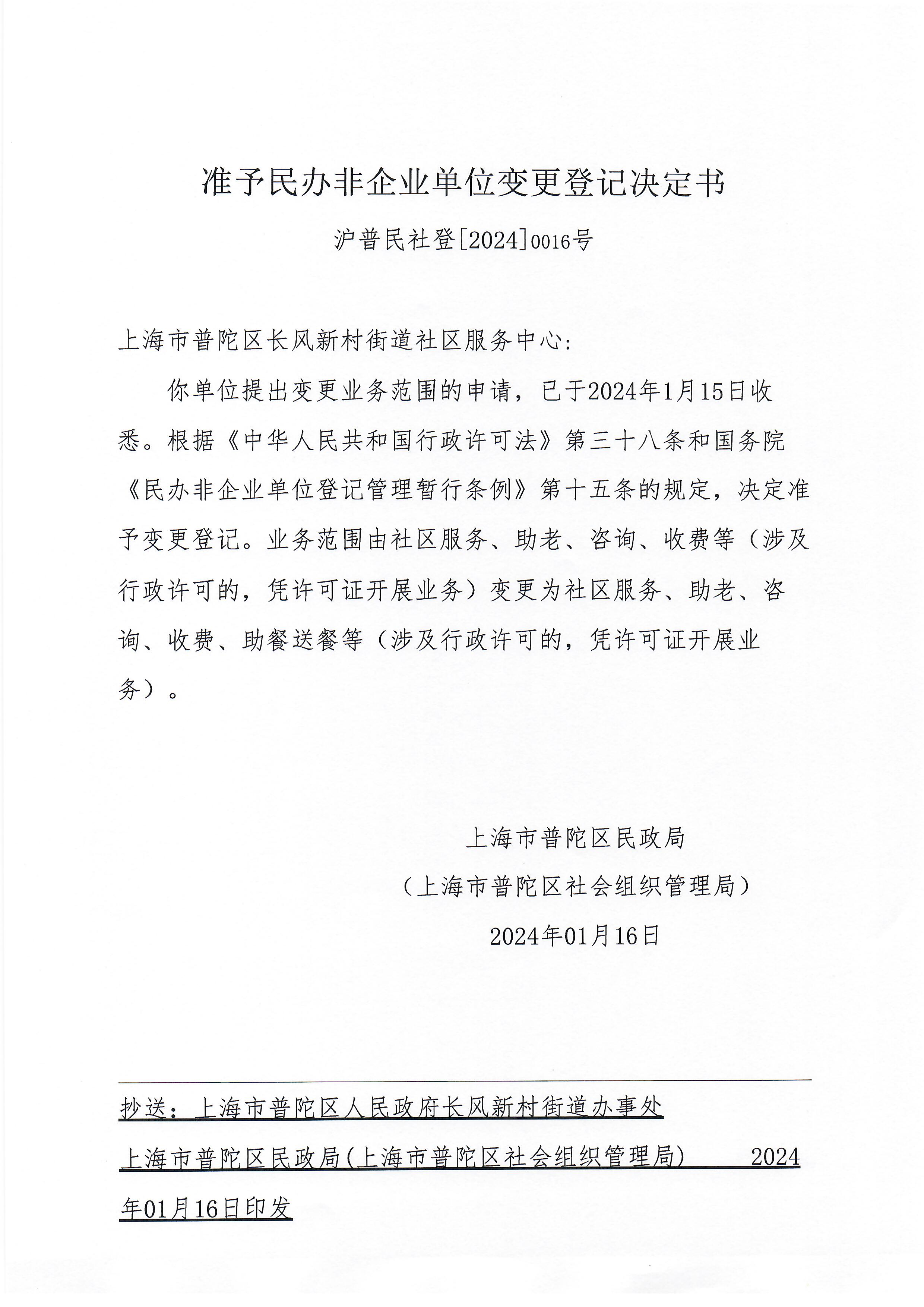 你单位提出变更业务范围的申请,已于2024年1月15日收悉。根据《中华人民共和国行政许可法》第三十八条和国务院《民办非企业单位登记管理暂行条例》第十五条的规定,决定准予变更登记。业务范围由社区服务、助老、咨询、收费等(涉及行政许可的,凭许可证开展业务)变更为社区服务、助老、咨询、收费、助餐送餐等(涉及行政许可的,凭许可证开展业务)。