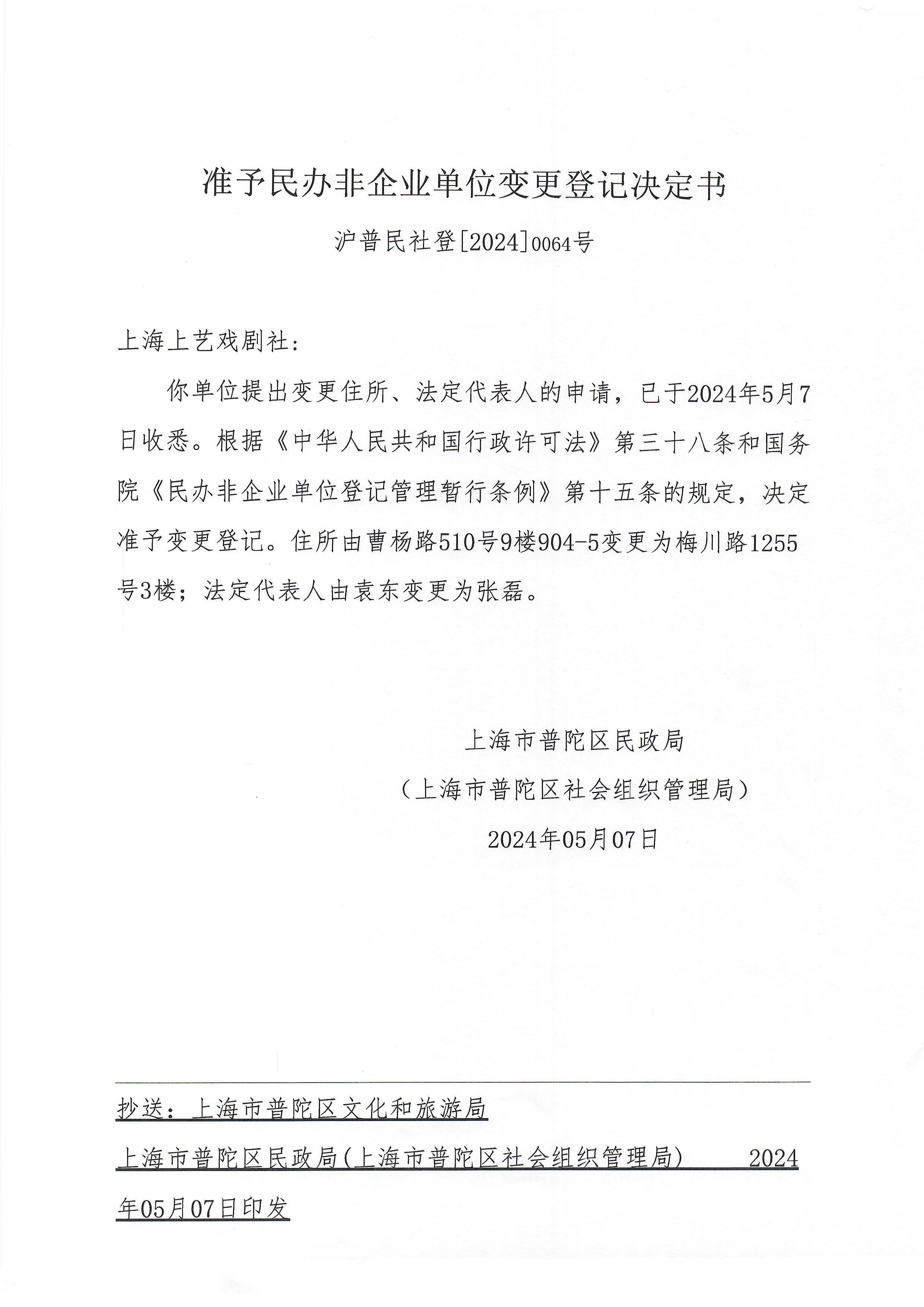 你单位提出变更住所、法定代表人的申请,已于2024年5月7日收悉。根据《中华人民共和国行政许可法》第三十八条和国务院《民办非企业单位登记管理暂行条例》第十五条的规定,决定准予变更登记。住所由曹杨路510号9楼904-5变更为梅川路1255号3楼;法定代表人由袁东变更为张磊。