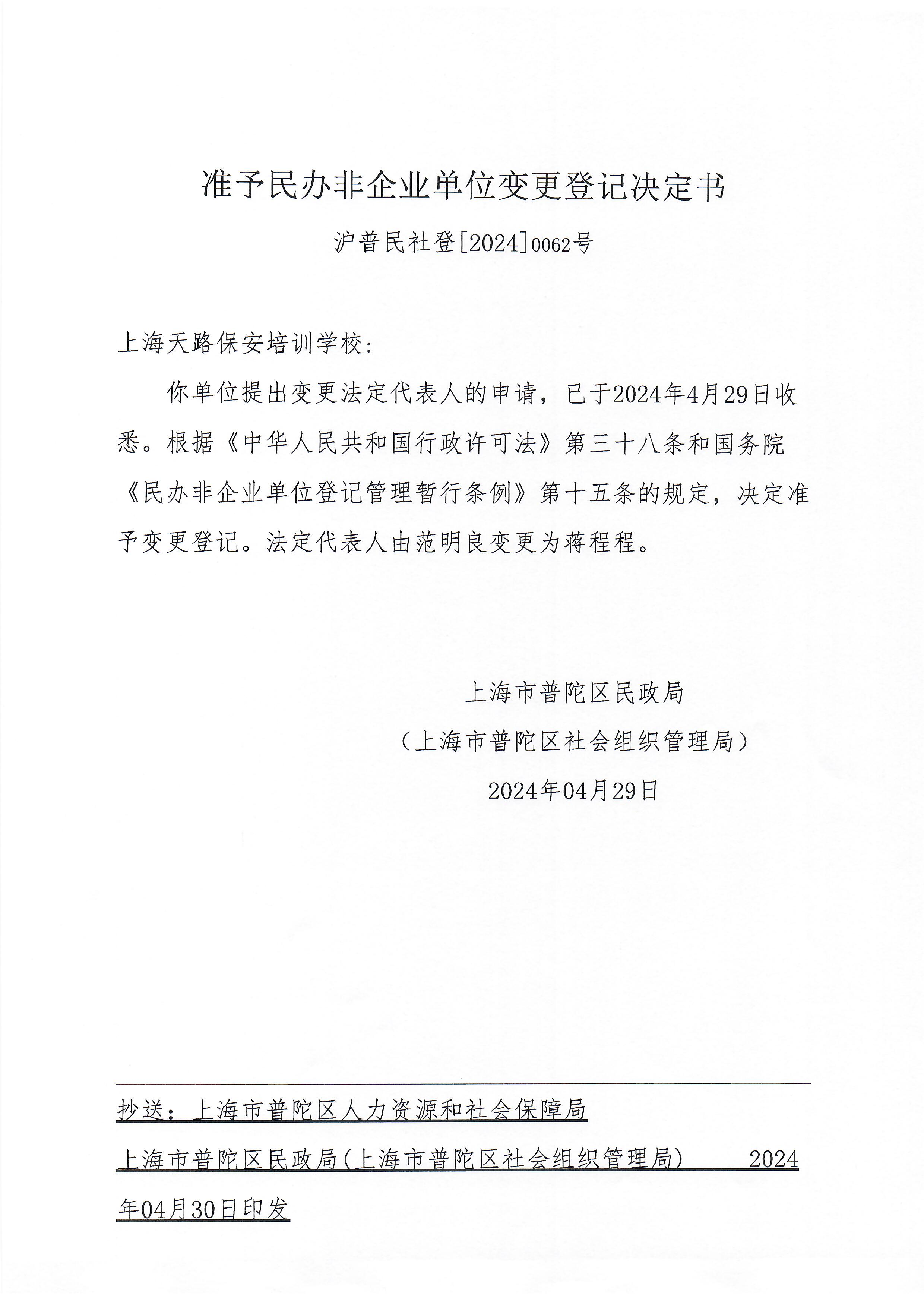 你单位提出变更法定代表人的申请,已于2024年4月29日收悉。根据《中华人民共和国行政许可法》第三十八条和国务院《民办非企业单位登记管理暂行条例》第十五条的规定,决定准予变更登记。法定代表人由范明良变更为蒋程程。